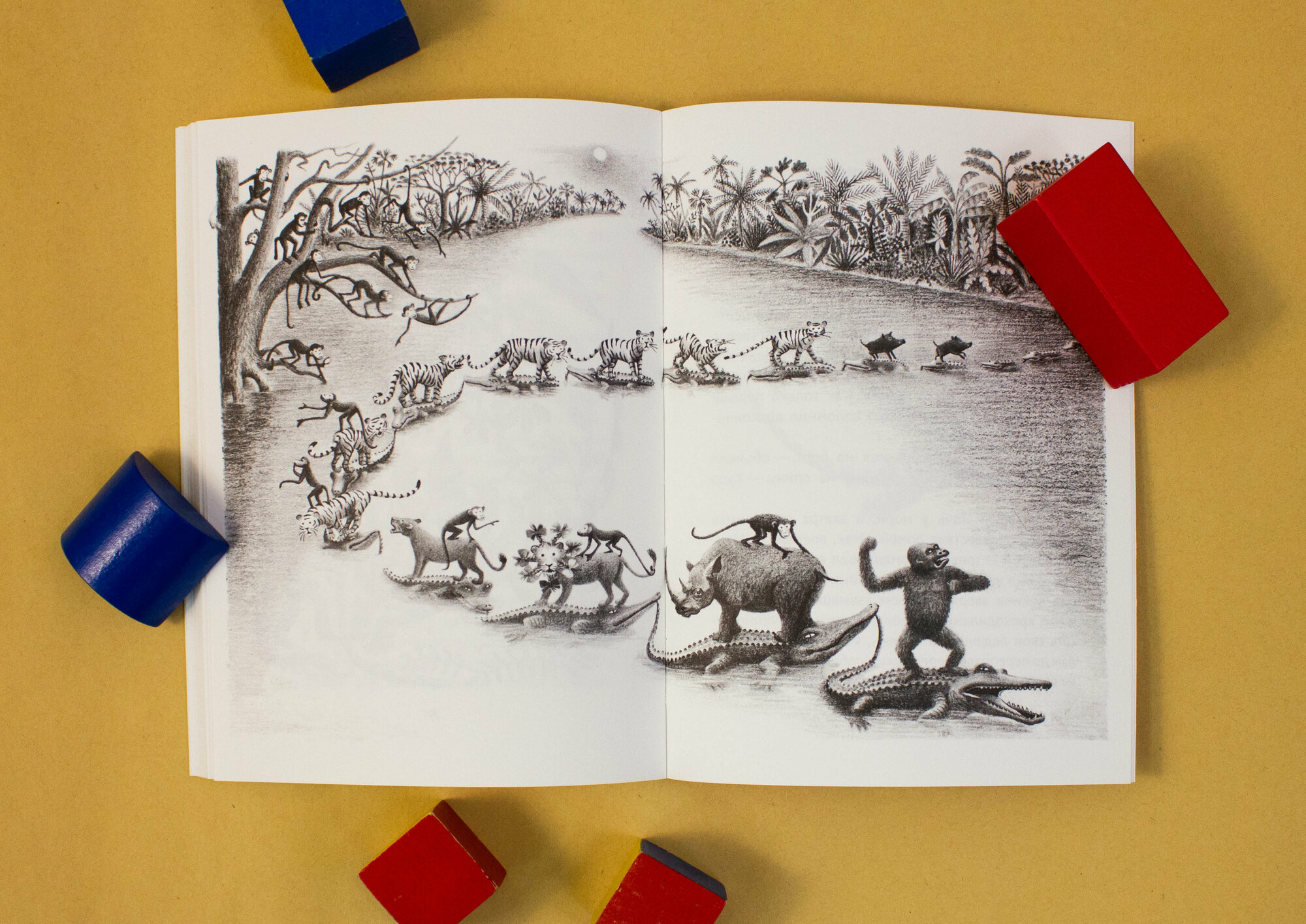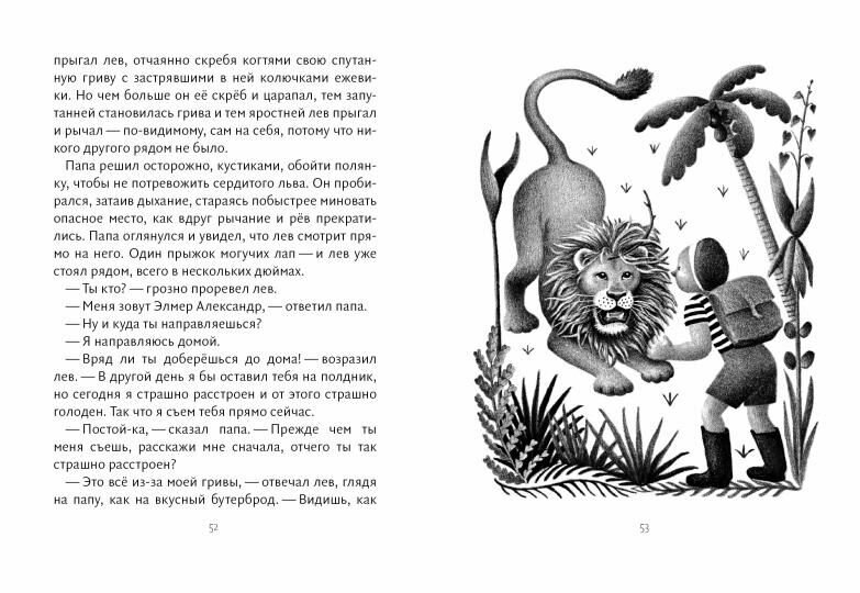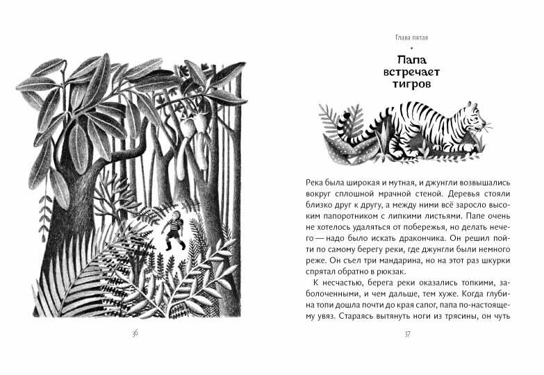 Как вы понимаете, все эти вещи, маленький папа берет с собой не зря: они ему пригодятся на Диком острове в самых опасных ситуациях. Ведь папе предстоит столкнуться с тиграми, носорогом, львом, гориллой, крокодилами. А эти звери шутить не любят! Каждого из них папе удается обхитрить, отвлечь внимание, чтобы двигаться дальше на поиски дракона. И поиски непременно должны увенчаться успехом!