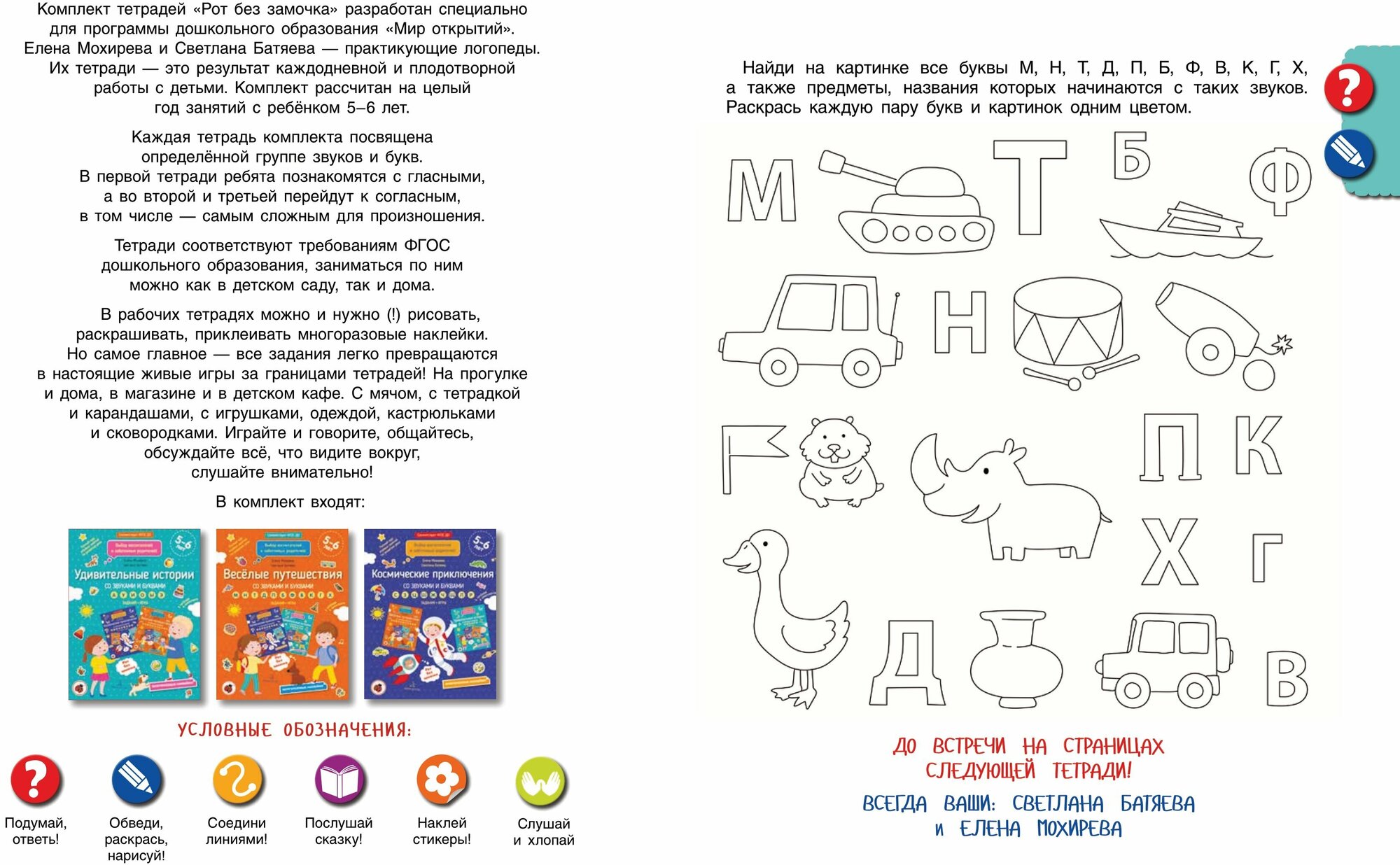 Комплект тетрадей "Рот без замочка" разработан специально для программы дошкольного образования "Мир открытий" (научный руководитель Л. Г. Петерсон). Рассчитан на целый год занятий с ребёнком 5 - 6 лет. Каждая тетрадь посвящена определённой группе звуков и букв. В первой тетради ребята познакомятся с гласными, а во второй и третьей перейдут к согласным, в том числе - самым сложным для произношения. Тетради соответствуют требованиям ФГОС дошкольного образования, заниматься по ним можно как в детском саду, так и дома. В тетрадях можно и нужно рисовать, раскрашивать, приклеивать многоразовые наклейки. Но самое главное - все задания легко превращаются в настоящие живые игры за границами тетрадей! На прогулке и дома, в магазине и в детском кафе. С мячом, с тетрадкой и карандашами, с игрушками, одеждой, кастрюльками и сковородками. Играйте и говорите, общайтесь, обсуждайте всё, что видите вокруг, слушайте внимательно!