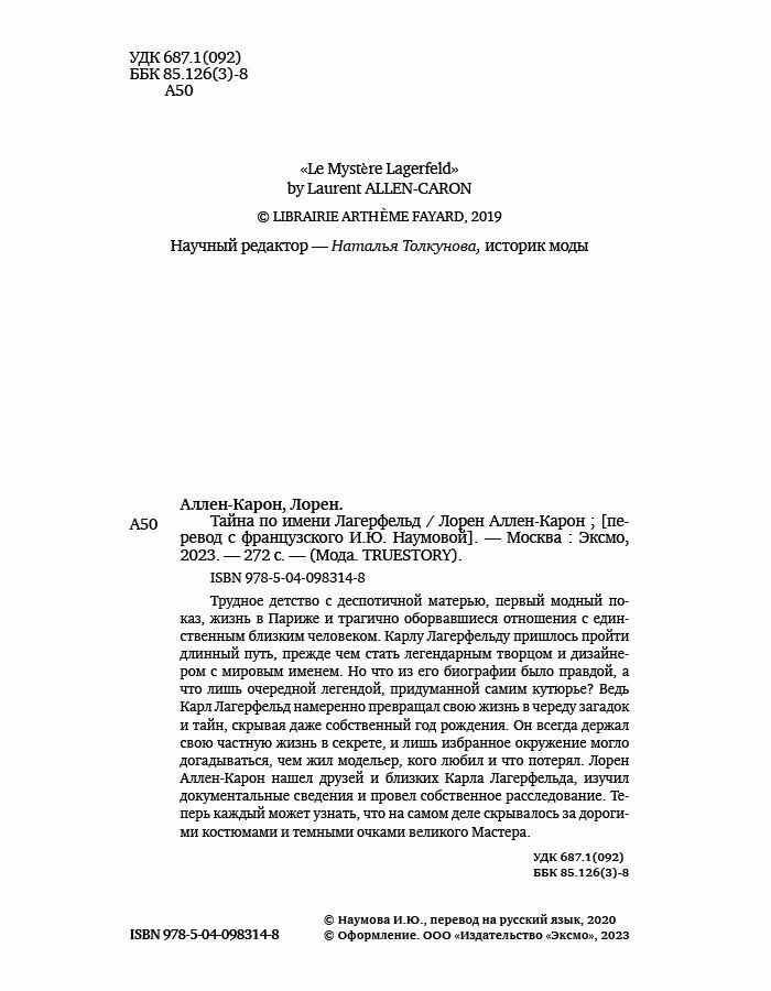 В книге, которая вышла в 2019 году под названием «Тайна по имени Лагерфельд» мы углубимся в детство, в становление личности, в несомненный успех этого великого творца. Детальное описание интерьера, костюмов погрузит читателя в уникальный мир, где современное граничит с эпохой возрождения.