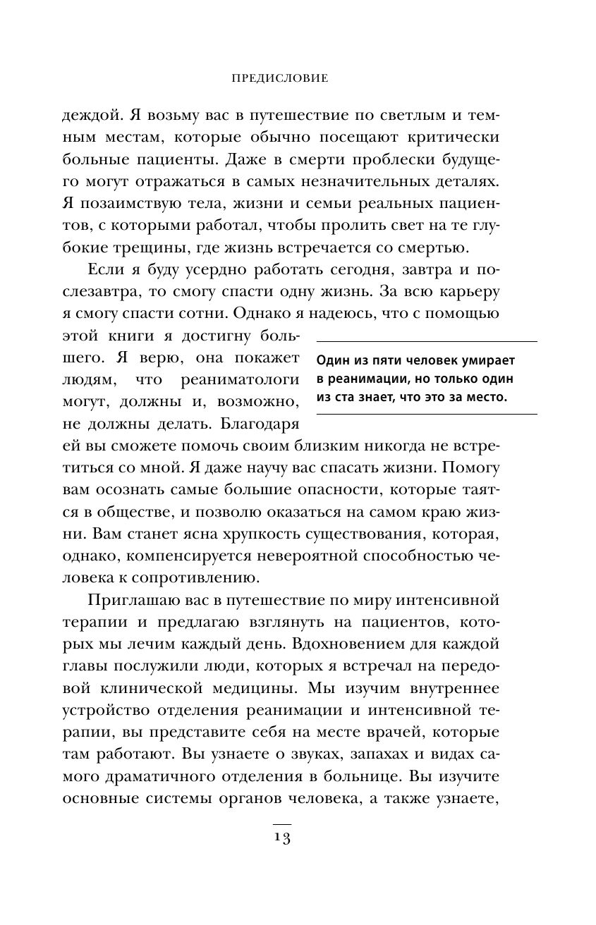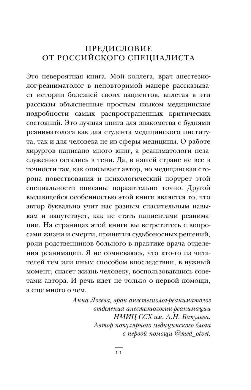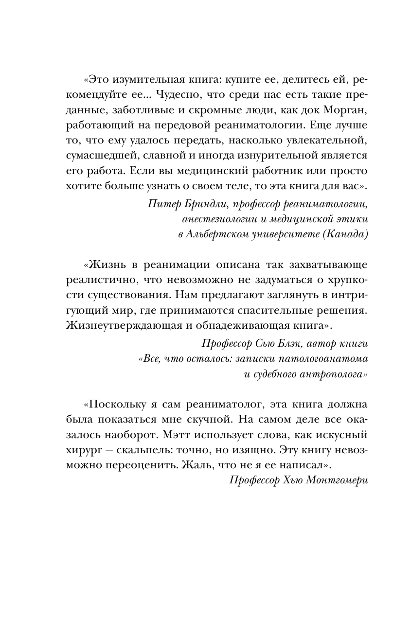 Какое самое драматичное отделение в больнице? Реанимация. И ее команда врачей круглосуточно заботится о самых тяжелых пациентах, даря им бесценный ресурс – время. Автор книги, Мэтт Морган, врач-реаниматолог, приглашает нас в мир интенсивной терапии и предлагает познакомиться с пациентами, которых он лечит каждый день. Вы узнаете об особенностях работы этого отделения, его звуках и запахах. Изучите основные системы органов человека, а также узнаете, как человек может жить без пульса и что происходит, когда умирает мозговой ствол. Автор делится с нами победами и поражениями, с которыми сталкиваются пациенты, члены их семей и медицинские работники в ходе борьбы со смертельно опасными травмами, болезнями и их осложнениями.