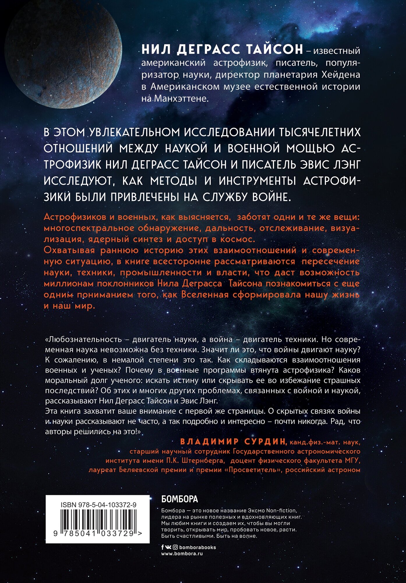 Новая книга известного американского астрофизика Нила Деграсса Тайсона, написанная в соавторстве с писателем Эвис Лэнг, посвящена исследованию многолетних отношений науки и армии. Что объединяет астрофизиков и военных специалистов, в чем точки их пересечения, как наука служит войне? Как выясняется, многие открытия и достижения астрофизики, такие как, например, многоспектральное обнаружение, дальность, отслеживание, визуализация, ядерный синтез и доступ в космос - это не просто научные открытия, а инструменты в руках войны.