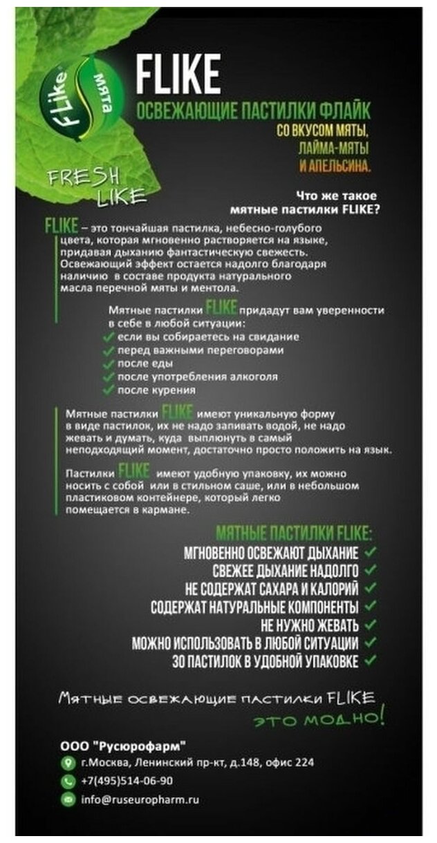 Пастилки для свежего дыхания FLIKE обладают приятным ароматом, освежают полость рта, сохраняя свежесть дыхания в течение длительного времени. Необычная первичная упаковка, в виде небольшого пластикового контейнера, внутри которого содержатся 30 тонких прозрачных голубых ароматных пастилок, очень миниатюрна и удобна в использовании, что позволяет хранить ее как в маленькой дамской сумочке, так и в кармане брюк.Вторичная упаковка мятных пастилок FLIKE в виде оригинально оформленного алюминиевого пакетика черного цвета со специальным замком-застежкой Зип-Лок предохраняет пастилки от влаги и внешних воздействий. Отверстие евро в верхней части пакетика дает возможность для удобного развешивания упаковки на стеллажах магазинов. Также, с двух сторон, в верхней части упаковки имеется место для надрыва пакетика.