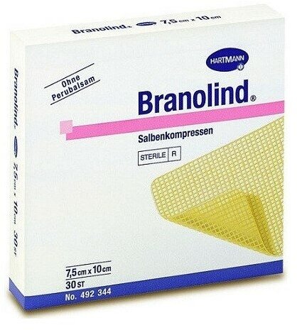 Ранозаживляющие атравматические мазевые повязки для лечения ожогов и пролежней в начальной стадии, трофических венозных язв, абсцессов, фурункулов, язв диабетической стопы, ссадин и других плохо заживающих ран, используются при трансплантации кожи.Ранозаживляющая сетчатая повязка BRANOLIND N восстанавливает кожные покровы на тканевом уровне, предотвращая развитие вторичной инфекции. Мазевые повязки BRANOLIND N выпускаются в виде хлопковой крупноячеистой ткани размером 7,5х10 см, которая пропитана специальным мазевым составом. Натуральная ткань с крупными ячейками хорошо пропускает воздух и раневое отделяемое (экссудат), не мешая его оттоку от пораженных участков кожи. Мазевая масса состоит из следующих компонентов: перуанский бальзам - 100 мг/2,0 г мазевой массы, белый вазелин, цетомакрогол 1000, глицерина моностеарат, жир гидрогенизированный, триглицериды среднего звена. Перуанский бальзам, который является основным действующим компонентом мазевого состава, содержит бензойную и коричную кислоты, ванилин и прочие ароматические соединения, комплекс которых обладает антисептическим, антибактериальным и противовоспалительным свойствами. Каждая повязка упакована индивидуально, в стерильную упаковку из фольги с отметкой для вскрытия. Размер всей повязки - 10 х 7,5 см. В наборе 30 повязок.
