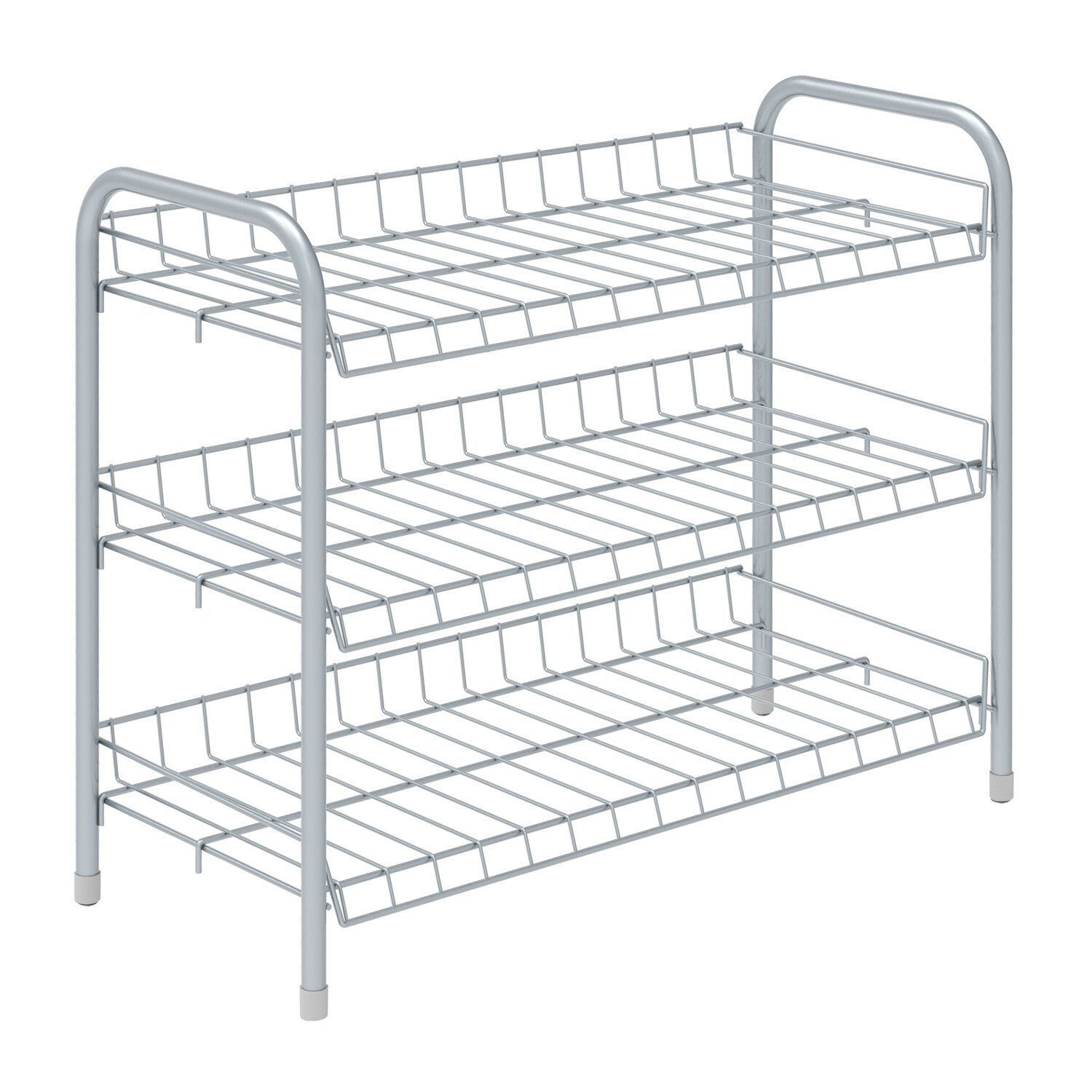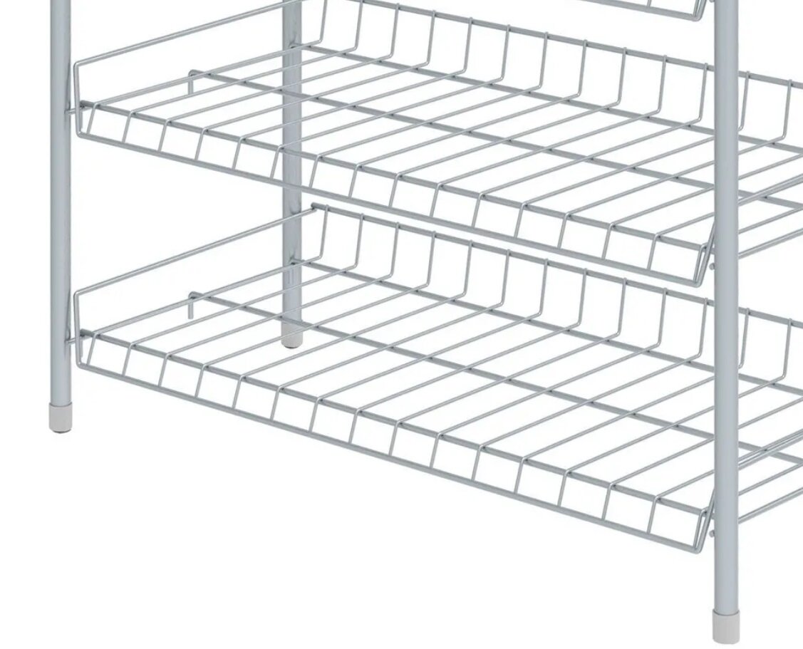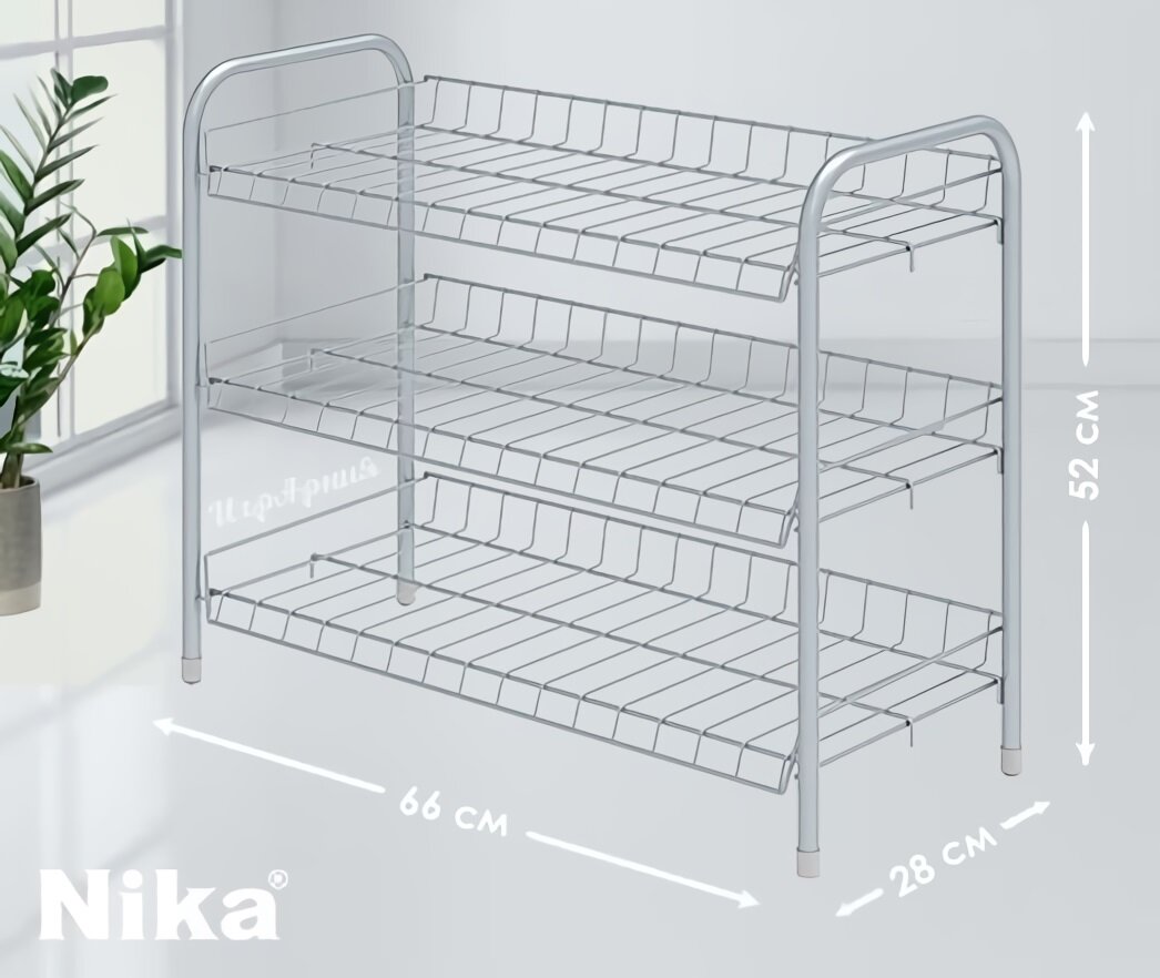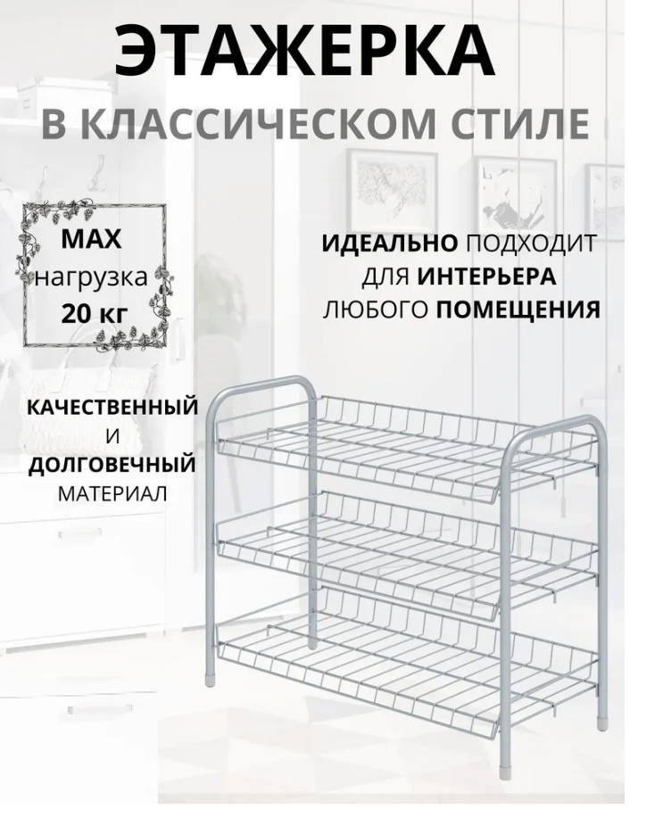 Этажерка для обуви – практичный вариант для обустройства небольшой прихожей. Компактная модель способна вместить наиболее часто используемую сезонную обувь. Конструкция с открытыми решетчатыми полками обеспечивает хорошую циркуляцию воздуха и позволяет не тратить лишние минуты на поиски нужной пары туфель или балеток. Боковые П-образные стойки удобно использовать как ручки при перемещении обувницы во время уборки. Опоры оснащены пластиковыми заглушками для защиты пола от царапин.