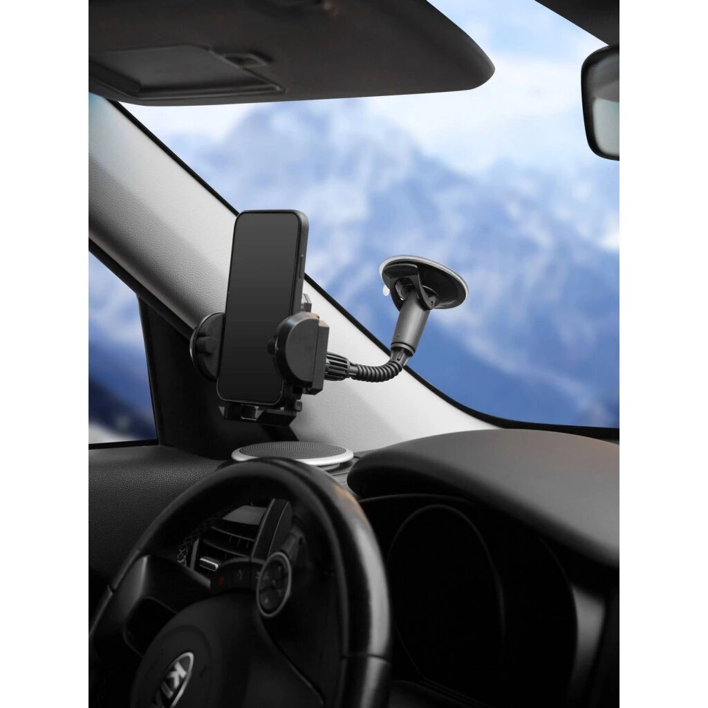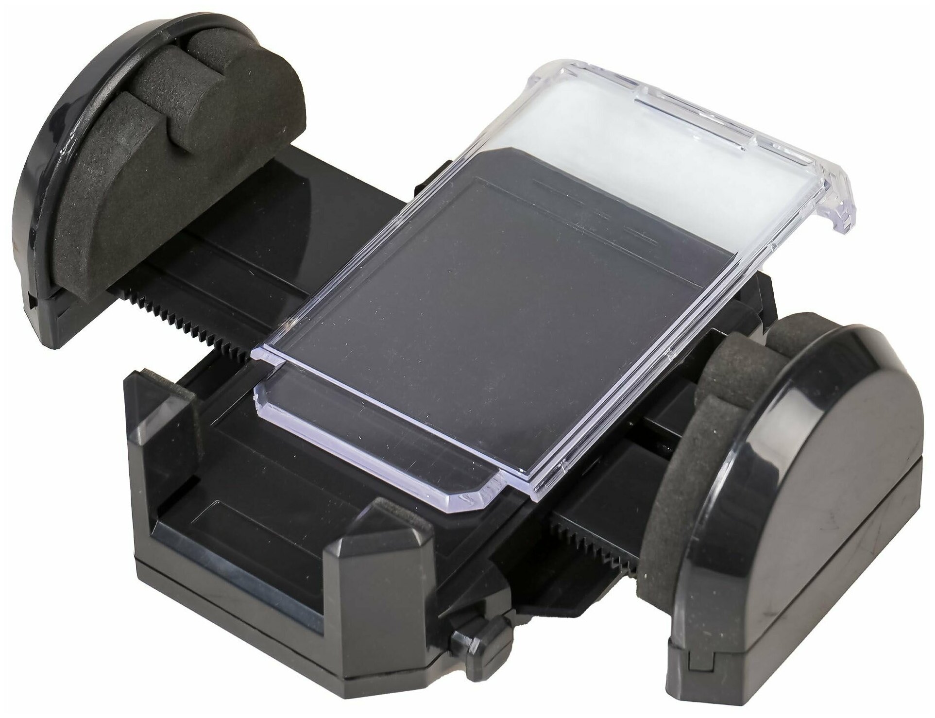 Держатель крепится на поверхность стекла при помощи присоски. Имеет несколько регулировок наклона. Резиновые накладки на прижимах надёжно удерживают устройство от выскальзывания.