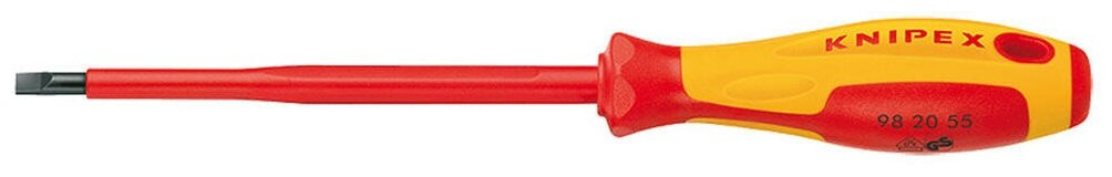 **Отвертка диэлектрическая Knipex** применяется при проведении ремонтных работ. Подходит для монтажа электрического оборудования, подключения счетчика. Имеет плотную изоляцию. Защитит от удара током, в том числе при попадании в обычную фазу. Ручка прямой формы сделана из двухкомпонентного пластика. Полотно изготовлено из стали, устойчивой к коррозии и воздействию влаги.