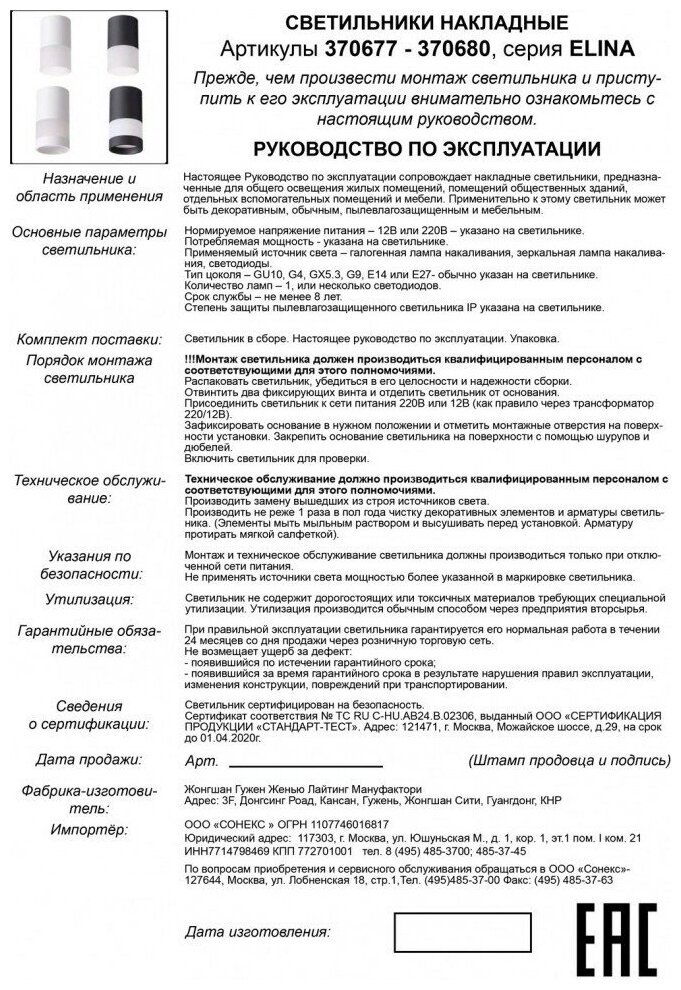 | особенности | Светильник предназначен для использования со светодиодной лампой. Установка ламп другого типа не допускается |