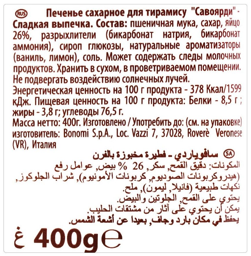 Печенье "Савоярди" Сахарное Bonomi - вкуснейшее бисквитное печенье, вкус которого, вне сомнения, сможет удивить и порадовать родных и близких. Идеально для приготовления Тирамису и тортов-мороженых. История компании Форно Бономи восходит к 1850 году, когда Форно Бономи открыл семейную пекарню в маленькой живописной деревне Веро Веронезе, расположенной высоко в горах неподалеку от Вероны, города Ромео и Джульетты. Со временем популярность кондитерских изделий росла и благодаря усилиям трех братьев, Дарио, Ренато и Фаусто и семейная компания Форно Бономи расширялась. Печенье Савоярди "Forno Bonomi" рекомендовано Федерацией итальянских шеф-поваров (FIC) для приготовления традиционного итальянского десерта "Тирамису".Данный товар отлично подойдет как подарок на новый год и рождество, подарок сестре на новый год, подарок на новый год взрослому, подарки на новый год подругам, подарок сестре на новый год, подарок бабушке на новый год, подарок новый год 2023, подарок девочке на новый год, подарки на новый год подругам, необычный подарок на новый год, новогодний подарок 2023, подарок девушке на новый год, подарок к новому году, подарки новый год, подарки коллегам на новый год, подарки на новый год 2023, подарки на новый год кролика, подарки на новый год маме, подарок другу на новый год, подарки на новый год коллегам, на новый год подарок, подарок учителю на новый год, подарок на новый год девушке, подарки на новый год женщине, подарки на новый год коллегам, Идеальный подарок для поздравления с новым годом 2023, на новый год. Наш товар это идеальный подарок к новому году, подарок маме на новый год, подарок на новый 2023 год, новогодний подарок, новогодний подарок, новогодний подарочный набор, подарок на новый год 2023, подарок на новый год подруге, подарок новогодний, подарок новый год, подарочный набор на новый год, подарки на новый год, на новый год подарок, новогодняя косметика, необычный новогодний подарок, подарок к новому году маме, подарок девушке на нг. Данный товар можно отнести к категории: новогодние подарки для взрослых, товары к новому году, все к новому году, новогодние подарки для девушек, подарки к новому году 2023, все для нового года 2023, новый год кролика, новогодние товары, товары на новый год, подарки на нг, новогоднее, новый год подарки взрослым, новый год 2023 кролика, подарки для женщины на новый год красота, новый год подарки, новый год кролик, набор на новый год, новый год 2023 символ года. Незаменимый подарок на рождество и новый год.