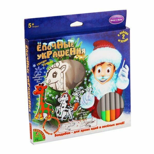 Яркие и забавные новогодние елочные игрушки в виде жирафа и лошадки можно сделать с набором для творчества Елочные украшения. Все, что нужно сделать - это надуть игрушку и раскрасить ее фломастерами. Они смывающиеся, так что перекрашивать жирафа и лошадку можно неограниченное количество раз, каждый раз украшая елочку по-новому.