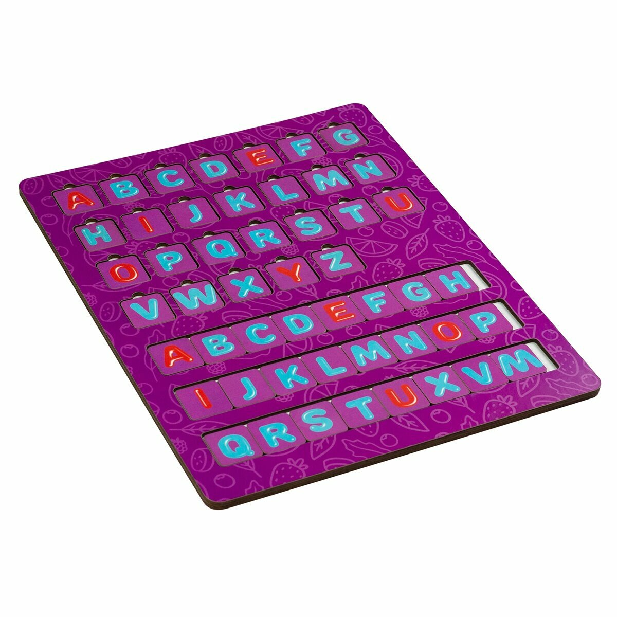 | Комплектация | деревянная панель с выемками под буквы – 1 шт., три строки с дополнительными буквами для выкладывания слов и слогов, английский алфавит |