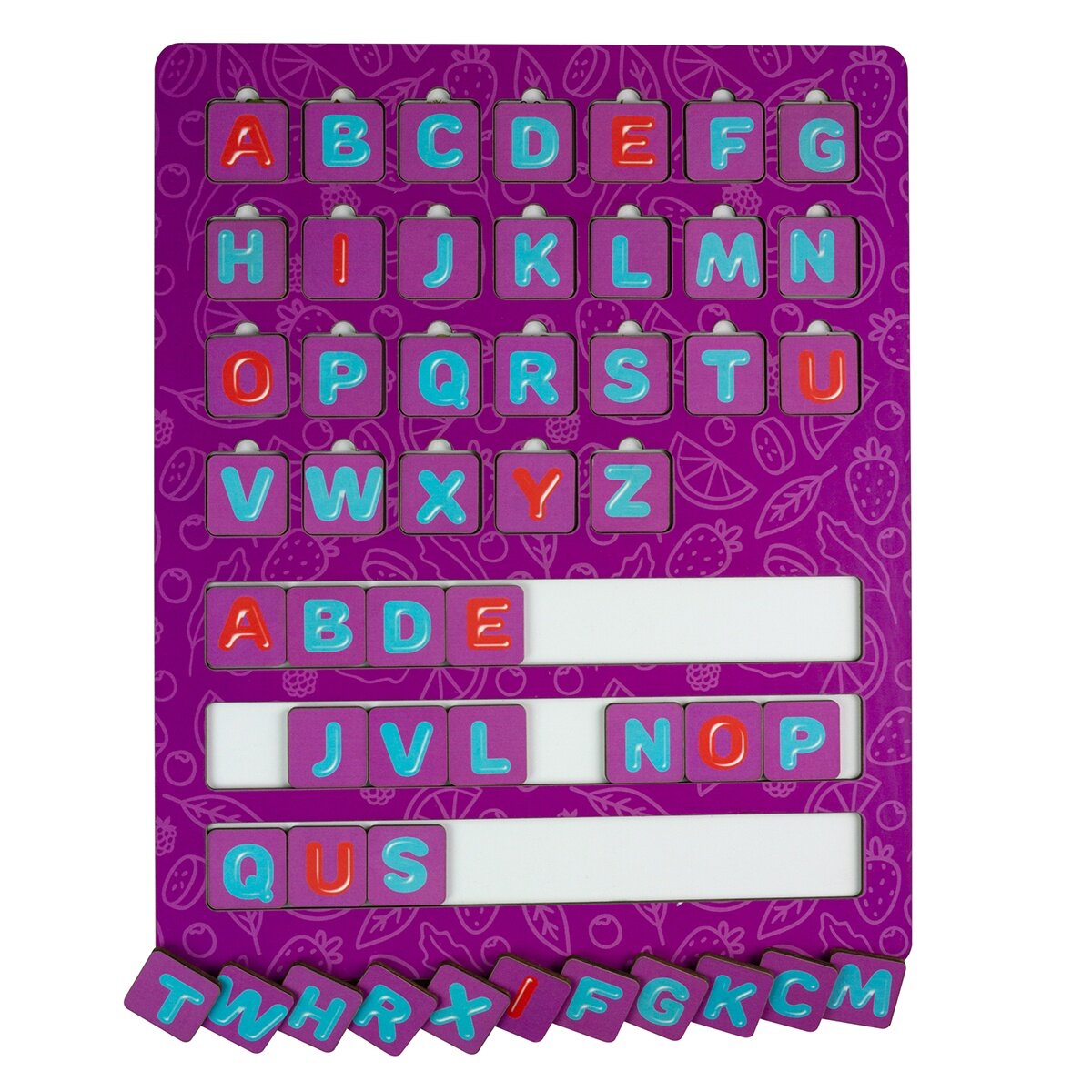 Комплектация: деревянная панель с выемками под буквы – 1 шт., три строки с дополнительными буквами для выкладывания слов и слогов, английский алфавит. Под каждой буквой находится картинка, название которой начинается с данной буквы, собранная в единой тематике – растения.
