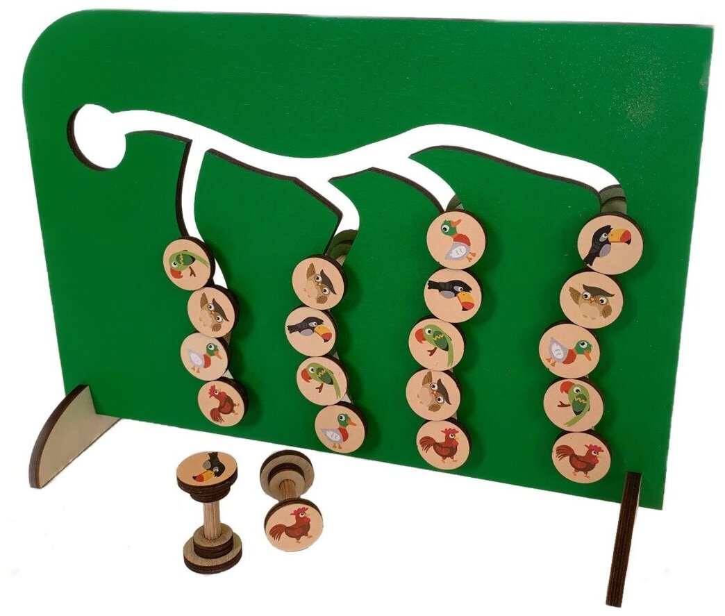 В комплект так же входят двухсторонние штанги для передвижения по лабиринту. На одной стороне штанги изображены птицы (утка, сова, попугай, петух, тукан), на другой стороне – цветные круги (цвета: голубой, красный, зеленый, желтый).