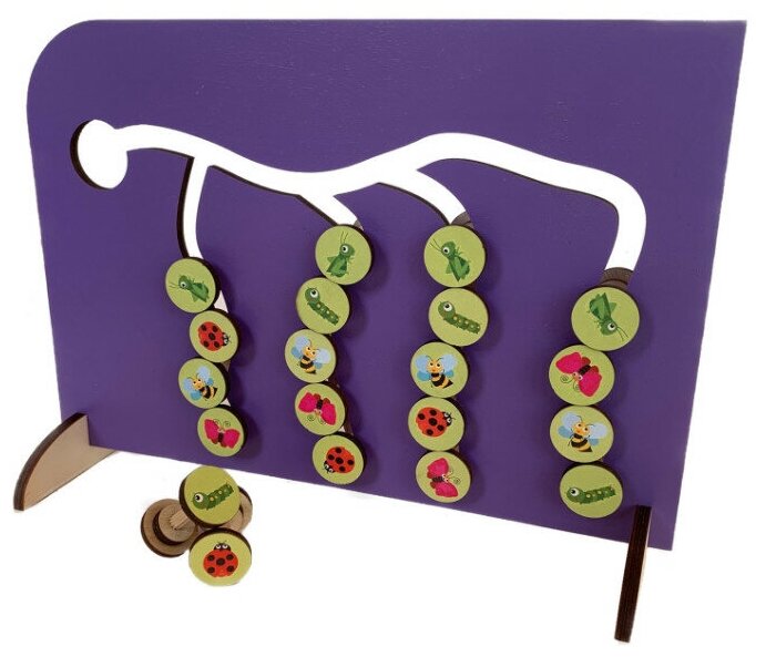 Правила игры: Предложите малышу передвигать штанги по прорезям, таким образом, чтобы одинаковые насекомые или цвета были вместе. Собери, пожалуйста, на одной дорожке все красные кружки. Давай соберем всех бабочек вместе, чтобы они не скучали.
