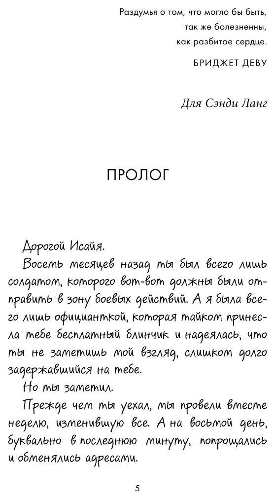 От автора бестселлеров "Wall Street Journal" и Amazon. comДорогой Исайя.Восемь месяцев назад ты был всего лишь солдатом, которого вот-вот должны были отправить в зону боевых действий. А я была всего лишь официанткой, которая тайком принесла тебе бесплатный блинчик и надеялась, что ты не заметишь мой взгляд, слишком долго задержавшийся на тебе.Но ты заметил.Прежде чем ты уехал, мы провели вместе неделю, изменившую все. А на восьмой день, буквально в последнюю минуту, попрощались и обменялись адресами.Я сохранила каждое письмо, которое ты прислал мне.Но несколько месяцев назад ты перестал отвечать, а вчера тебе хватило наглости прийти в наше кафе и вести себя так, словно ты никогда в жизни меня не видел.Подумать только. я почти полюбила тебя и твою прекрасную сложную душу.Почти.В чем бы ни заключалась причина твоего поведения, я надеюсь, она достаточно весомая.Марица-официанткаP. S. Я тебя ненавижу, и на этот раз. я серьезно.
