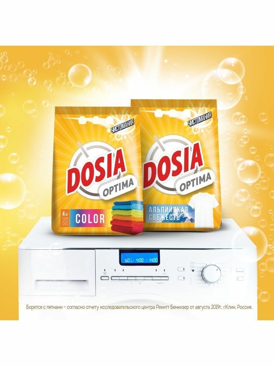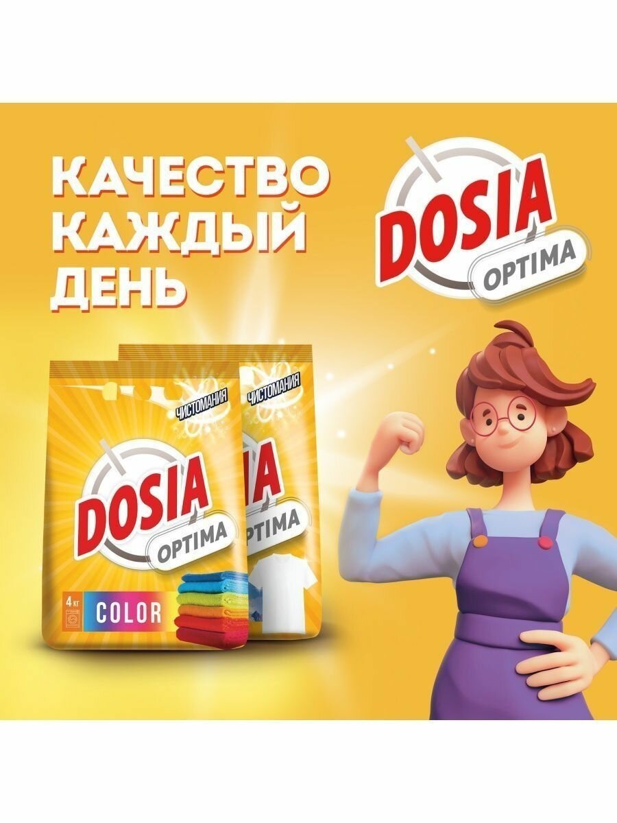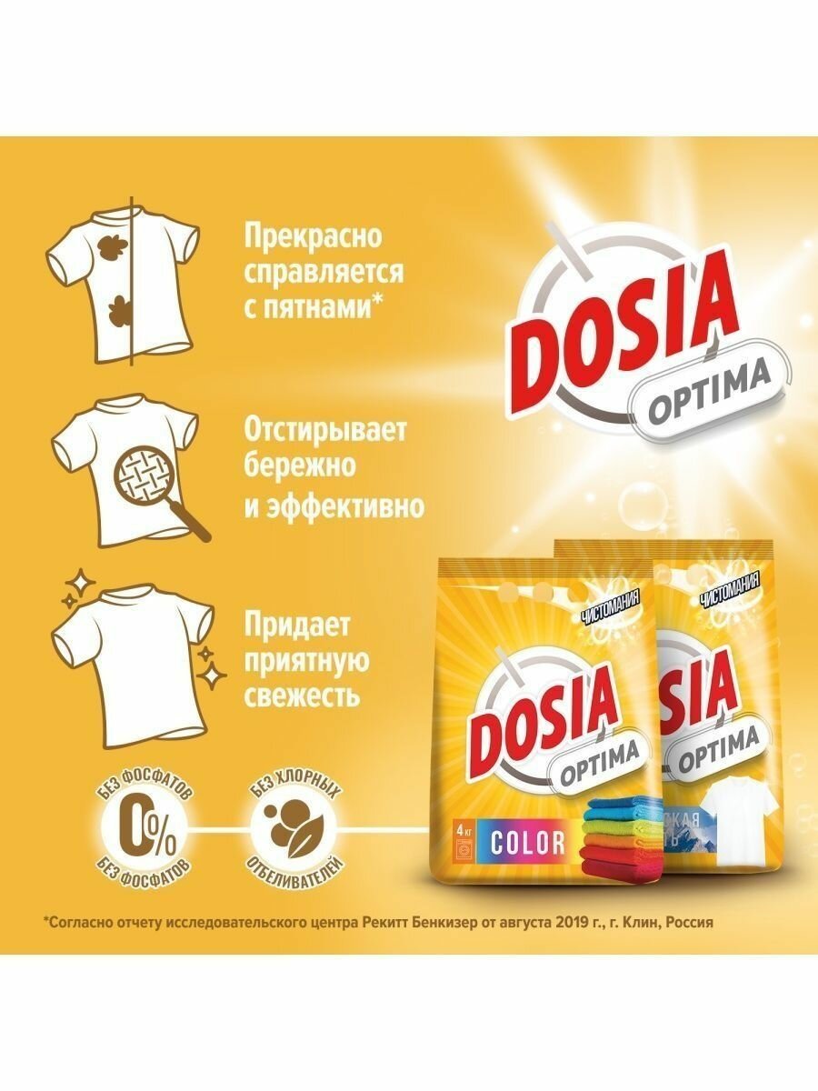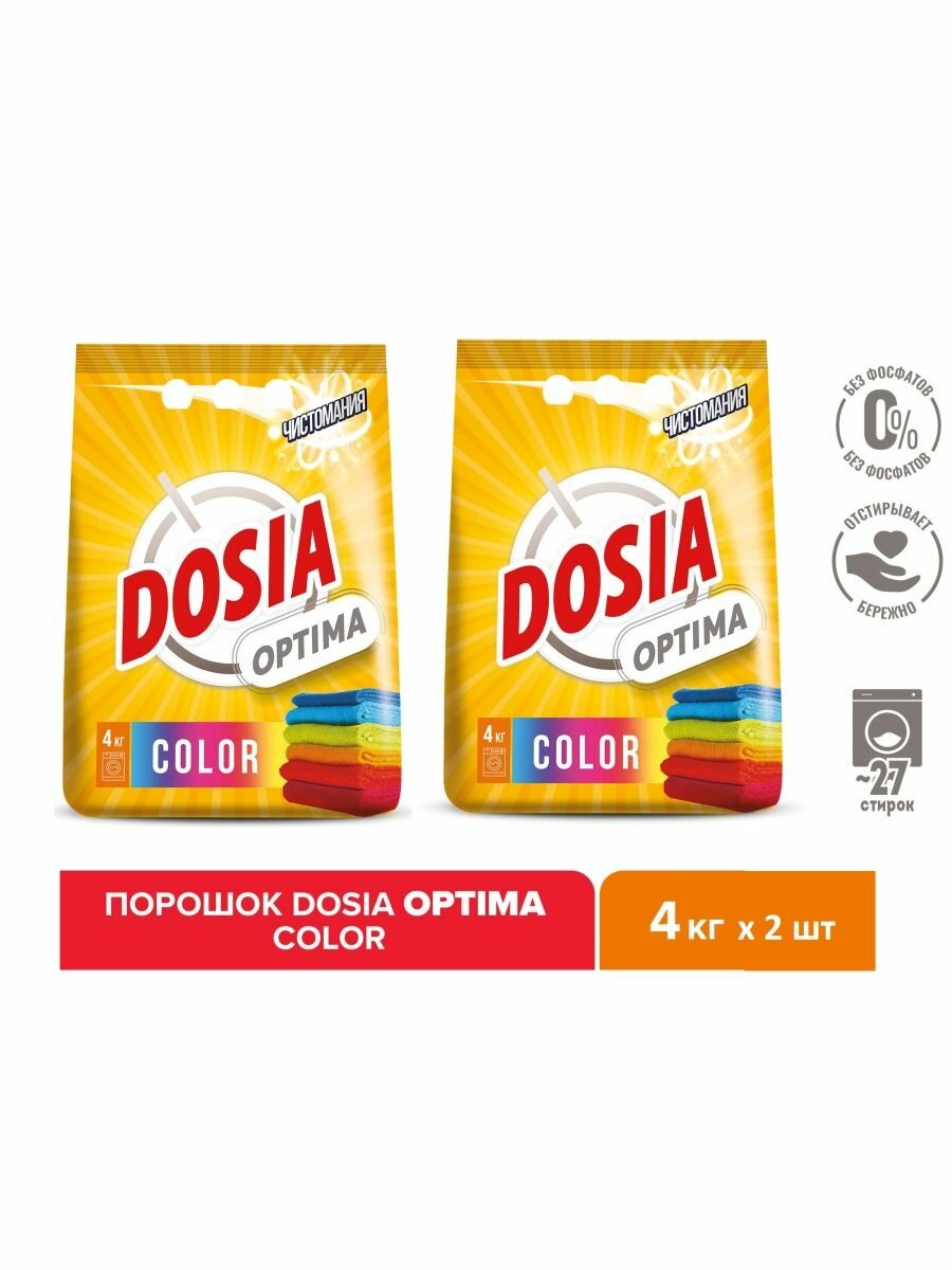 Dosia optima Color - отлично справится с различными загрязнениями и придаст белью неповторимую свежесть. Благодаря оптимальной формуле для повседневной стирки, порошок Dosia:- Прекрасно справляется с различными пятнами- Отстирывает бережно и эффективно, не повреждая волокна ткани- Придает белью приятную свежестьСпециально разработанная формула порошка Дося Оптима Колор- содержит компоненты для эффективного отбеливания- не содержит фосфаты- не содержит хлорных отбеливателей.
