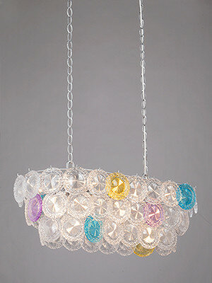 Люстра V5295 предназначена для просторных помещений: свет 23 ламп-миньонов создаст в интерьере праздничную атмосферу. Силуэт удерживаемого двумя цепями светильника напоминает облако: высоту подвеса можно регулировать путем изменения количества звеньев. На каркасе из хромированного металла закреплен декор из прозрачного и цветного хрустального стекла. Середина каждого элемента украшена рисунком в виде концентрического круга, края декорированы причудливым рельефным узором.