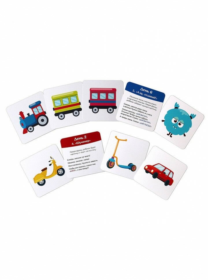 | Комплектация | 35 карточек с заданиями, 93 карточки с иллюстрациями, пластилин, поролоновый кубик, трубочка, 4 ленты, 12 больших карт, спичечная соломка, конфетти, пёрышки, правила игры |