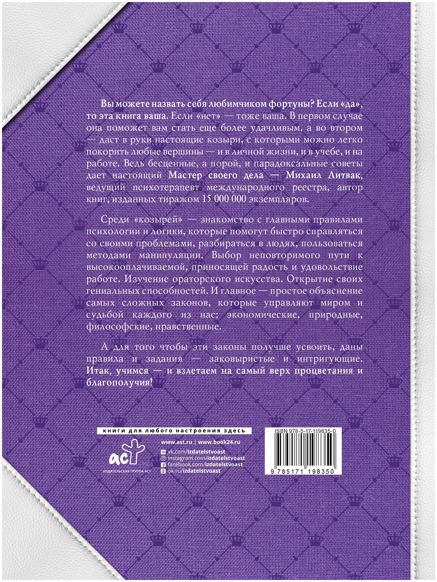 Вы можете назвать себя любимчиком фортуны? Если "да", то эта книга ваша. Если "нет" - тоже ваша. В первом случае она поможет вам стать еще более удачливым, а во втором - даст в руки настоящие козыри, с которыми можно легко покорить любые вершины - и в личной жизни, и в учебе, и на работе. Ведь бесценные, а порой, и парадоксальные советы дает настоящий Мастер своего дела - Михаил Литвак, ведущий психотерапевт международного реестра, автор книг, изданных тиражом 15 000 000 экземпляров. Среди "козырей" - знакомство с главными правилами психологии и логики, которые помогут быстро справляться со своими проблемами, разбираться в людях, пользоваться методами манипуляции. Выбор неповторимого пути к высокооплачиваемой, приносящей радость и удовольствие работе. Изучение ораторского искусства. Открытие своих гениальных способностей. И главное - простое объяснение самых сложных законов, которые управляют миром и судьбой каждого из нас: экономические, природные, философские, нравственные. А для того чтобы эти законы получше усвоить, даны правила и задания - заковыристые и интригующие. Итак, учимся - и взлетаем на самый верх процветания и благополучия!