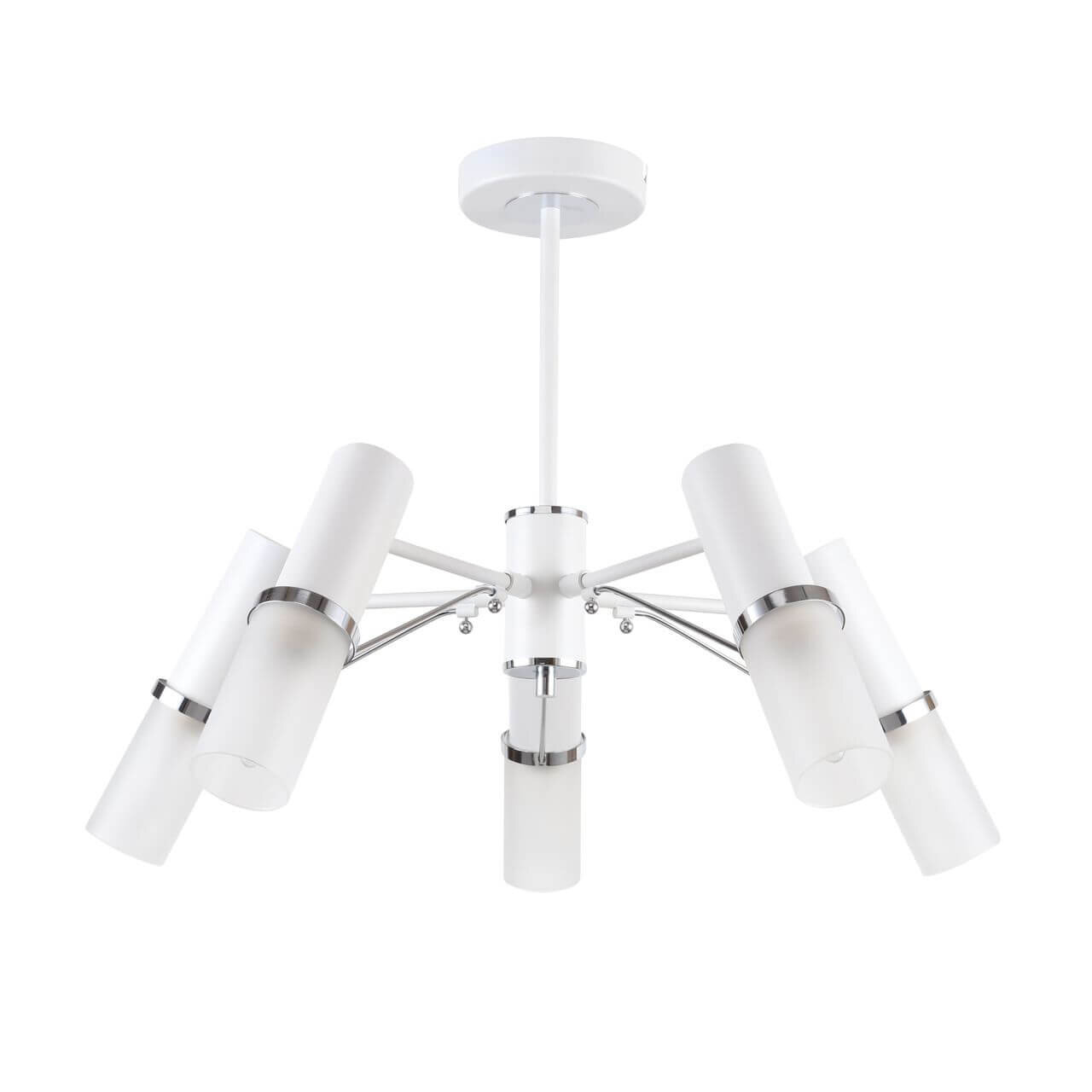 Дизайн и материалы: Арматура люстры выполнена из металла и стекла, что придает ей прочность и долговечность. Белый цвет арматуры с хромированными элементами делает ее визуально легкой и воздушной. Плафоны изготовлены из стекла и имеют цилиндрическую форму, что обеспечивает равномерное распределение света.