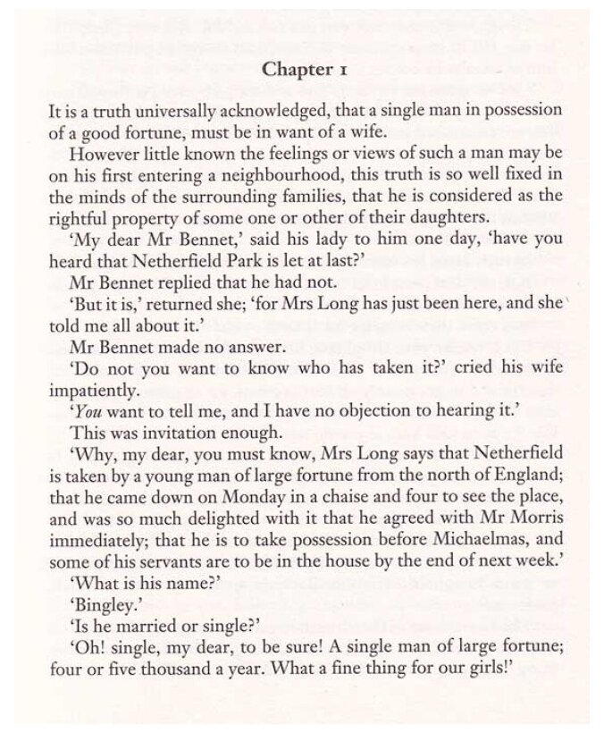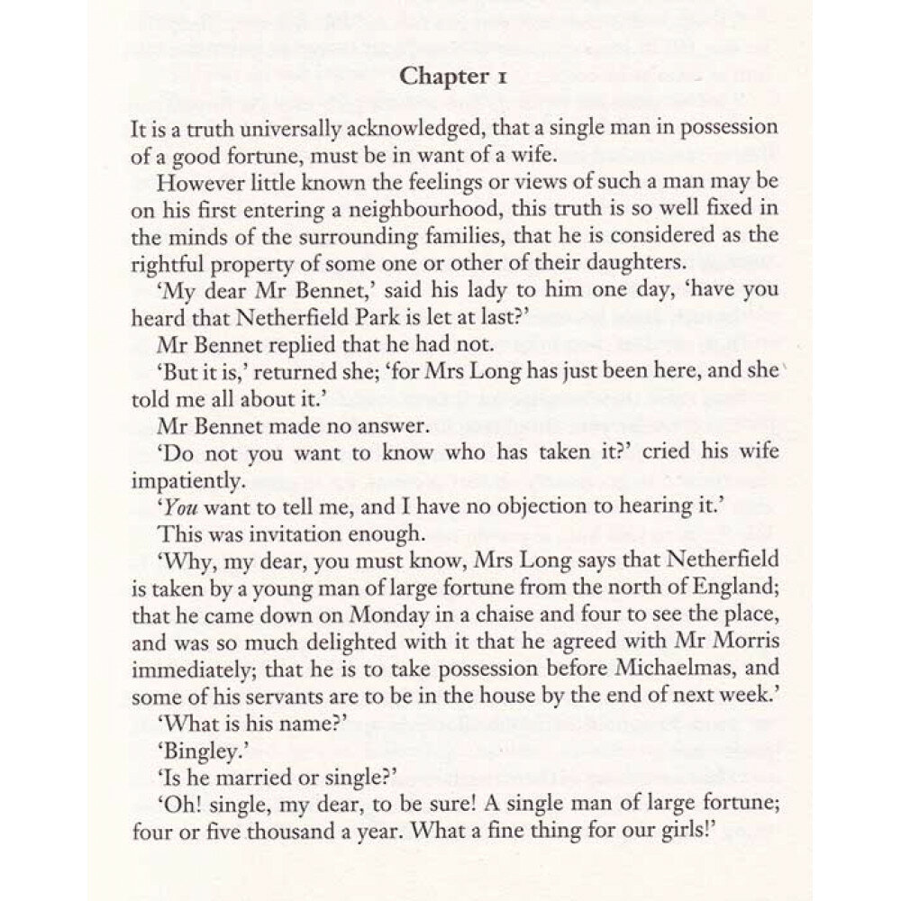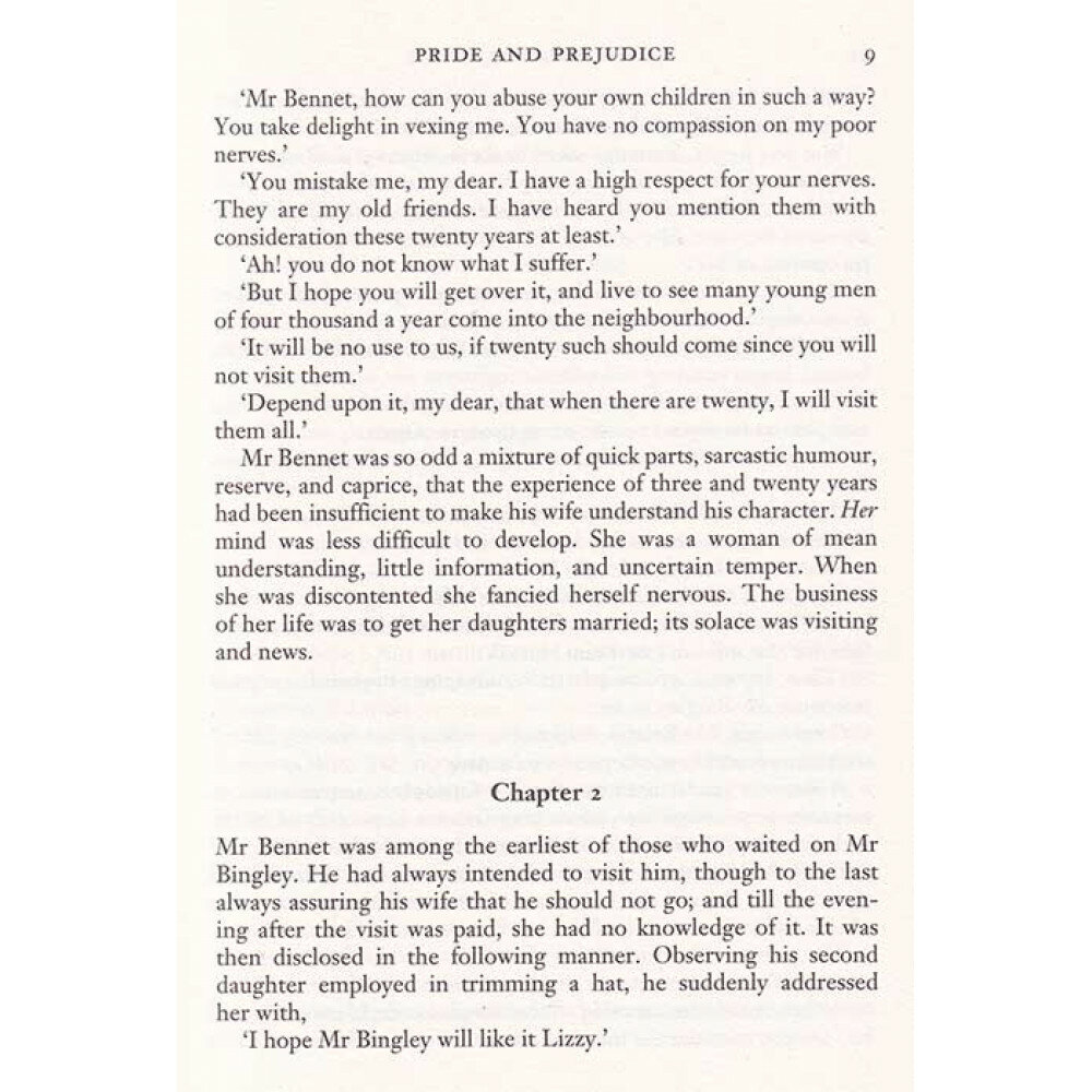 Pride and Prejudice, which opens with one of the most famous sentences in English Literature, is an ironic novel of manners. In it the garrulous and empty-headed Mrs Bennet has only one aim - that of finding a good match for each of her five daughters. In this she is mocked by her cynical and indolent husband.