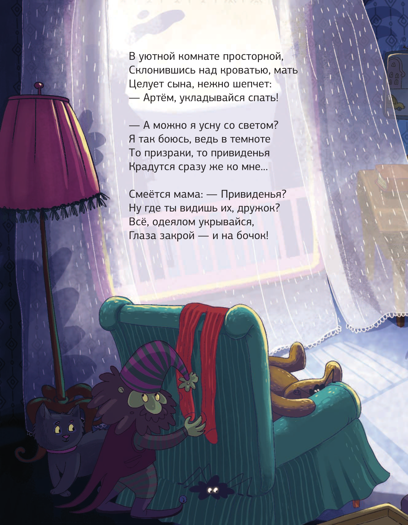 Преотличная книга для укладывания малыша спать. Даже если ваше чадо не испытывает ночных страхов, то ему будет интересно узнать про такой феномен, будет интересно поразглядывать на страницах гномов, приведений и всяких паучков.