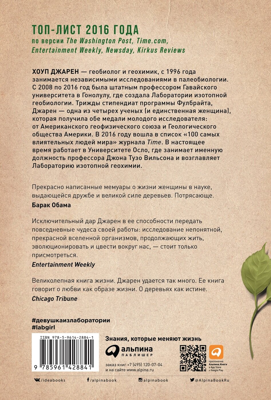 Деревья, как и люди, упорны, изобретательны и способны адаптироваться к любым условиям. Геобиолог Хоуп Джарен, трижды стипендиат программы Фулбрайта, уже более 20 лет изучает деревья, семена, цветки и почву и не перестает удивляться поразительным возможностям растений. Ее книга «Девушка из лаборатории» — автобиография ученого, влюбленного в свою работу.