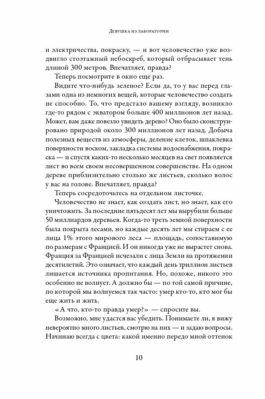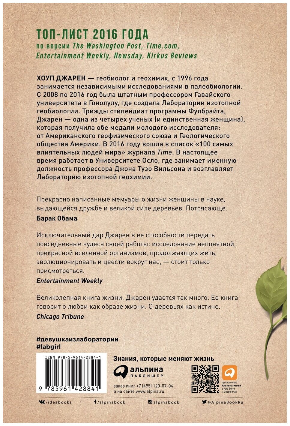 Книга “Девушка из лаборатории” - это автобиография женщины-ученого, геобиолога Джарен Хоуп, в которой честно и без прикрас показан весь путь становления ее как профессионального исследователя. Параллельно увлекательно рассказывается о растениях, в том числе деревьях. В книге отражены все те проблемы, которые могут встретиться на пути женщины в науку. Это и неудачи в попытке собрать необходимые данные, и трудности в получении финансирования, и насмешки коллег-ученых. Но вместе с тем в книге рассказывается и о радости научного озарения, и о любви к науке, растениям, а также из чего состоит работа учёных. И все это описывается с определенной долей юмора. Периодически автор даже сравнивает растения с людьми. То чему людям можно поучиться у деревьев - терпению, с которым семена ждут подходящего момента, чтобы пойти на риск и выпустить первый корешок.