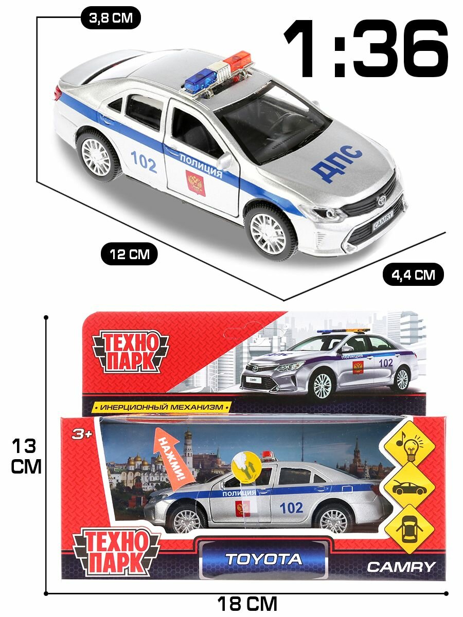 Машинка «Toyota Camry Полиция» ТМ «Технопарк» представляет собой точную лицензионную копию настоящей. Это металлическая модель, выполненная в серебристом цвете с синей полоской, надписями «ДПС» и «Полиция 02». У машинки открываются двери и багажник, можно рассмотреть салон внутри. Сверху установлены проблесковые маячки, которые мигают и звучат при нажатии кнопку. Оснащена инерционным механизмом: если поставить машинку на ровную поверхность, потянуть за корпус и отпустить, то она поедет сама. Развивает мелкую моторику, воображение, расширяет кругозор. Размер 12 см. Рекомендуется детям от 3 лет.