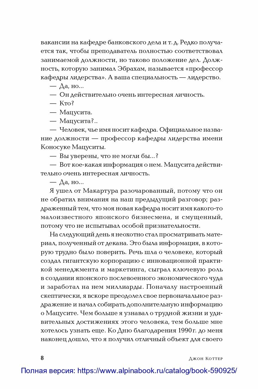 Коносуке Мацусита — величайшая личность в истории современного бизнеса. Он является не только основателем Matsushita Electric, одной из крупнейших мировых компаний, но и ярким лидером, новатором в сфере управления бизнесом. В книге Джона Коттера рассматривается история развития Matsushita Electric от крохотной фирмы в Осаке до транснациональной корпорации. Большое внимание уделяется методам управления, применяемым Мацуситой для достижения лидерства в бизнесе, и взаимосвязи этих методов с его оригинальными философскими взглядами.