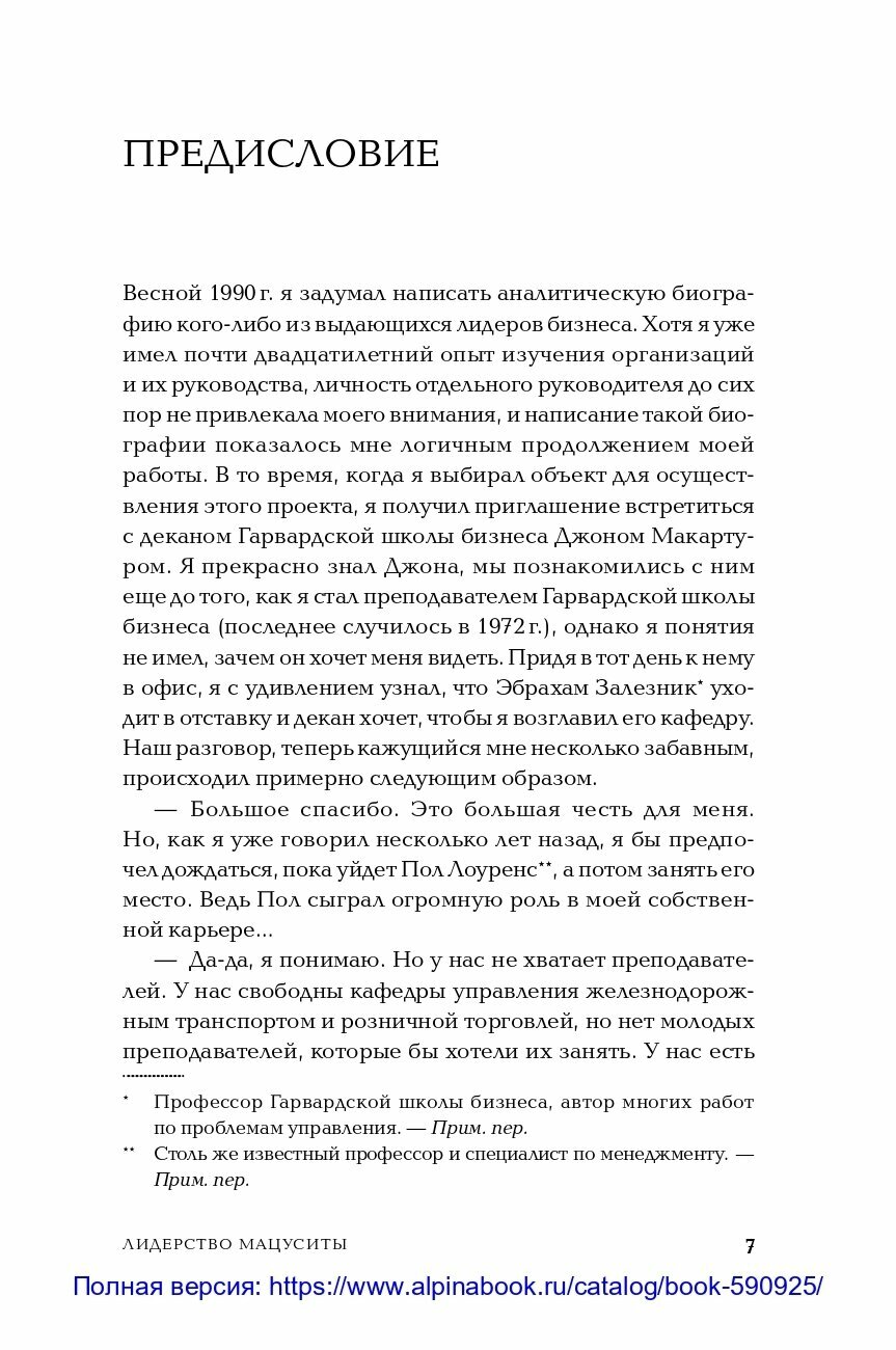 В книге «Лидерство Мацуситы: Уроки выдающегося предпринимателя ХХ века» также подробно описывается жизненный путь самого Коносуке Мацуситы, анализируются причины превращения плохо образованного провинциального юноши, в раннем возрасте пережившего несколько семейных трагедий, в лидера бизнеса, новатора в сфере менеджмента и выдающегося общественного деятеля.