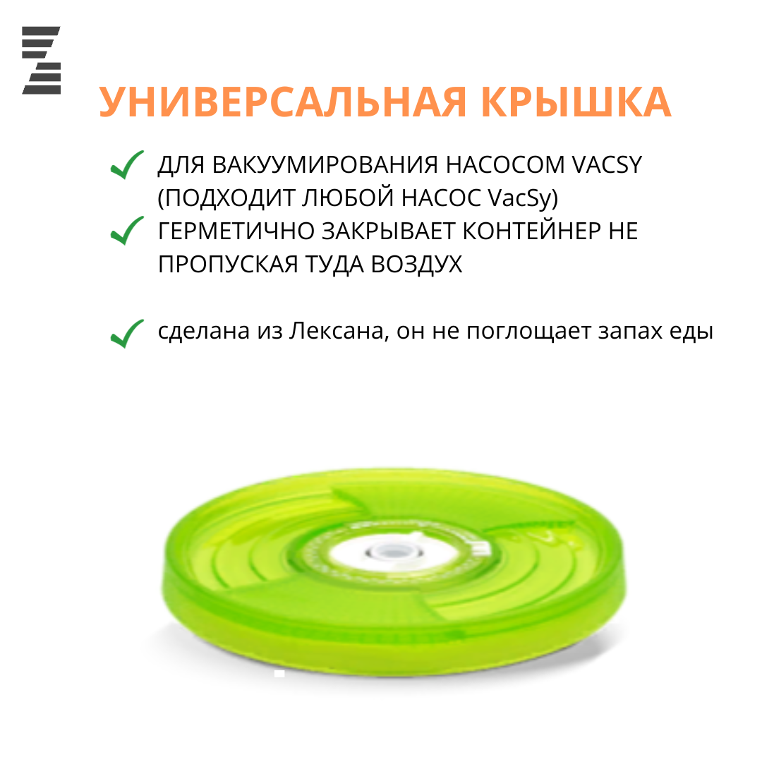 Универсальные крышки предназначены для установки на емкости, в которых продаются порционные продукты (банки, стаканы и т. д.) и для использования с элементами запатентованной линии VacSy®. Вакуум сохраняет открытый джем, маринады и соусы, оставляя их в оригинальной упаковке и продлевая качество, аромат и вкус. Крышки бывают двух размеров, с их помощью можно хранить соки, смузи, супы, рагу, томатный соус, фруктовые салаты и многое другое. Крышка для контейнеров диаметром от 4 до 8 см.вакуумное хранение здоровой пищиСделаны из безопасного пищевого материала. КАК ЭТО работает:Интеллектуальный, удобный и простой в использовании вращающийся диск G обладает следующими характеристиками: Клапан – отверстие для присоединения насоса VacSy®. Положение “VACUUM” (вакуумирование) позволяет удалить воздух. Положение “CLOSE” (закрыто) герметично закрывает контейнер. Положение “OPEN” (открыто) открывает запечатанную емкость. - На всех крышках VacSy® имеется встроенный календарь с указателем месяца E и ДНЯ F. Таким образом, вы будете знать точное время вакуумирования продуктов и сроки их хранения.