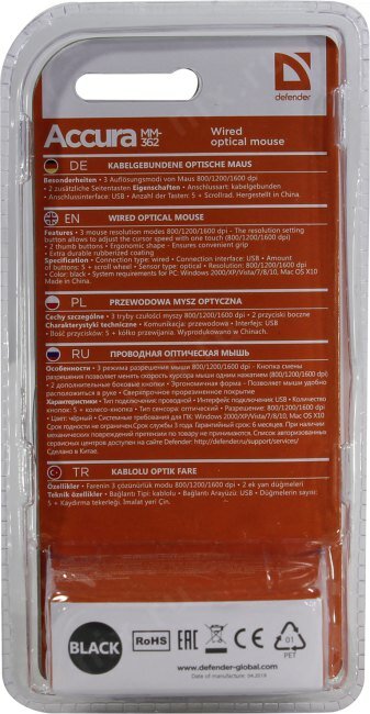 | Прочее | 3 режима разрешения мыши 800/1200/1600 dpi Кнопка смены разрешения позволяет менять скорость курсора мыши одним нажатием (800/1200/1600 dpi). 2 дополнительные боковые кнопки Эргономичная форма Позволяет мыши удобно расположиться в руке. Сверхпрочное прорезиненное покрытие Системные требования для ПК - Windows 2000/XP/Vista/7/8/10, Mac OS X10 |