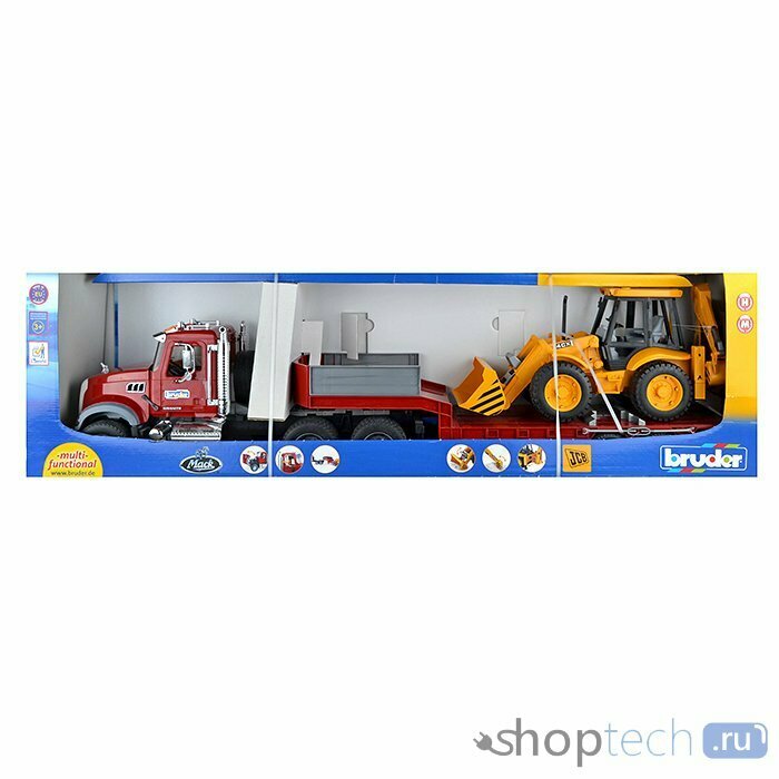Тягач с прицепом–платформой Bruder MACK с колёсным экскаватором–погрузчиком JCB 4CX Особенности: На этот тягач может быть загружена для перевозки иная, подходящая по размерам техника. В погрузчике установлено вращающееся сиденье, поворачивающийся на 180° манипулятор, амортизаторы на одной из осей. В данном наборе есть много функционирующих элементов, которые будут интересны для изучения и пригодятся для игр. Cоздан в масштабе 1 к 16, поэтому идеально совместим с иными машинками, автомобилями и спец. техникой Брудер соответствующей серии.
