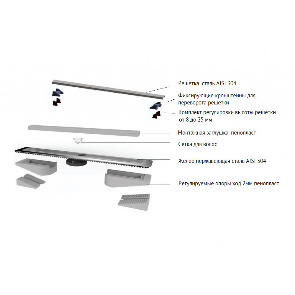 - Двусторонняя установка решетки: металл и вклейка плитки с регулировкой по высоте от 8 до 25 мм.