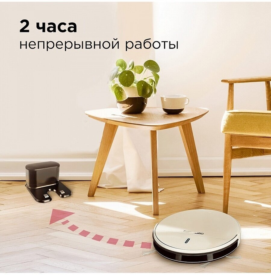 Емкий литий-ионный аккумулятор обеспечивает непрерывную работу прибора до 120 минут. За это время пылесос может успеть навести порядок в большой 2-3-комнатной квартире. Когда уровень заряда аккумулятора снизится, прибор самостоятельно вернется на зарядную станцию.