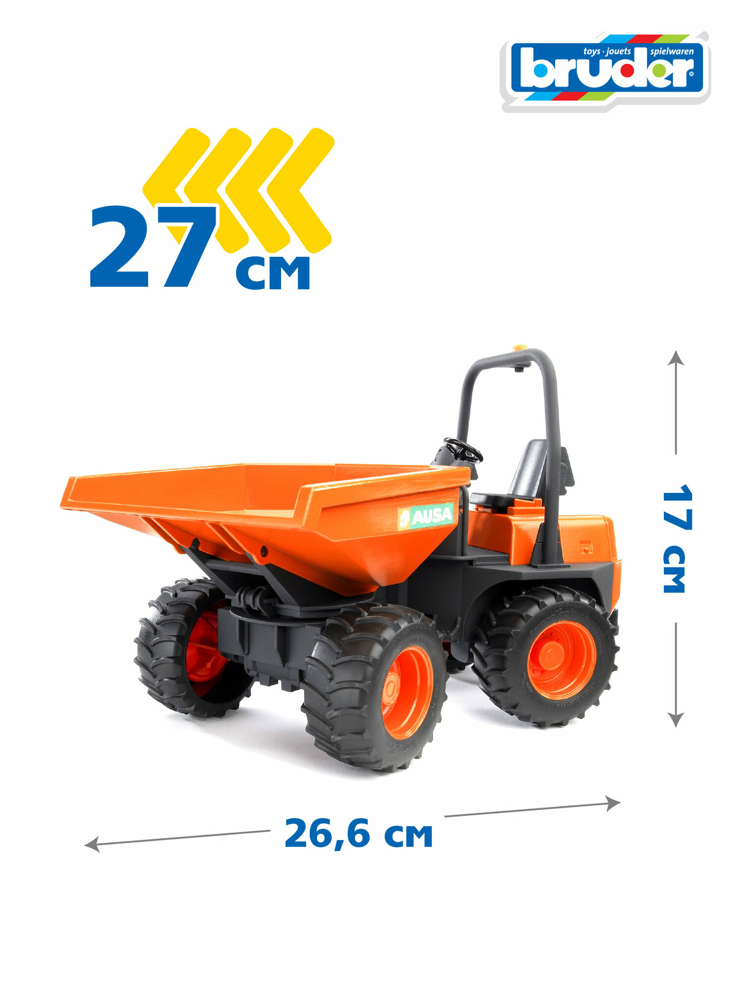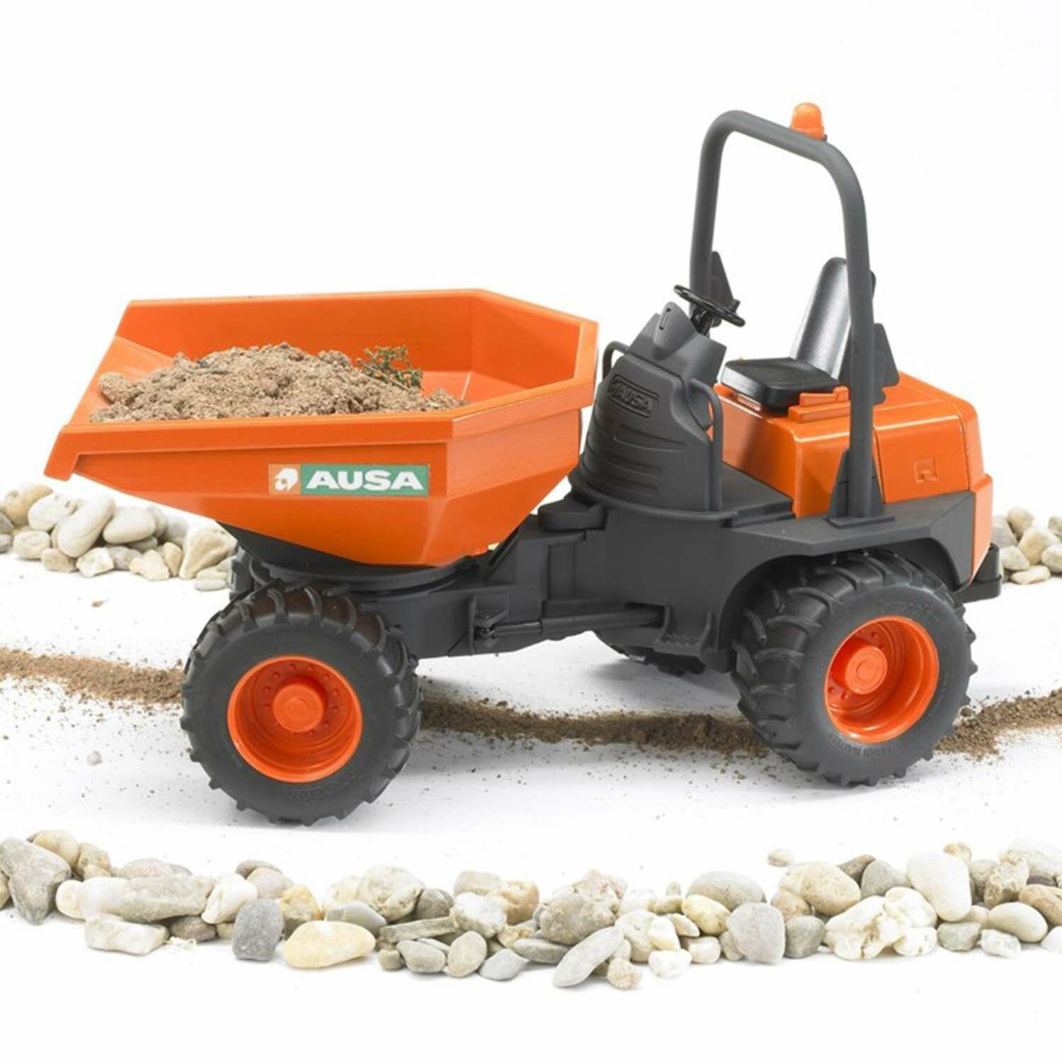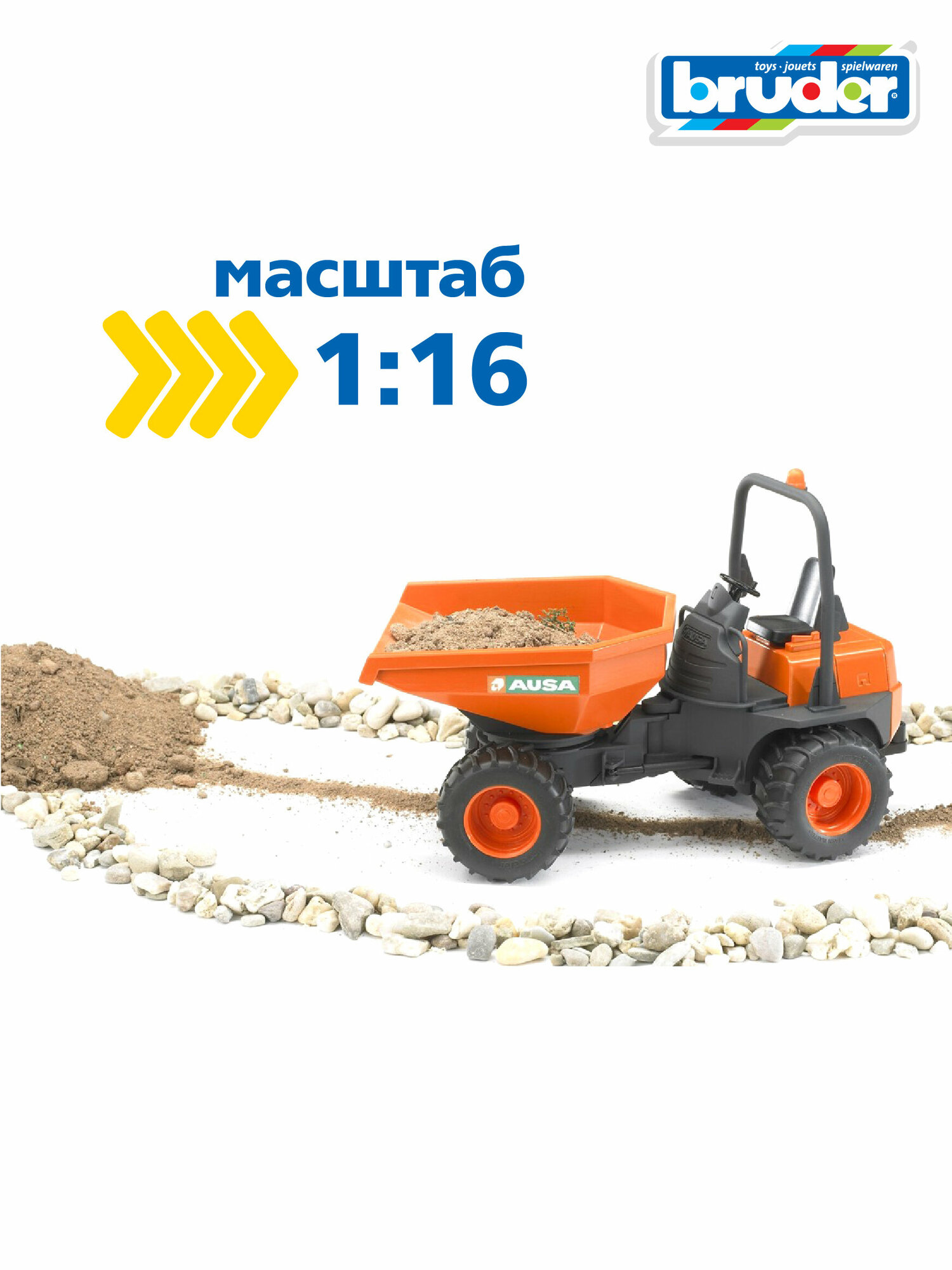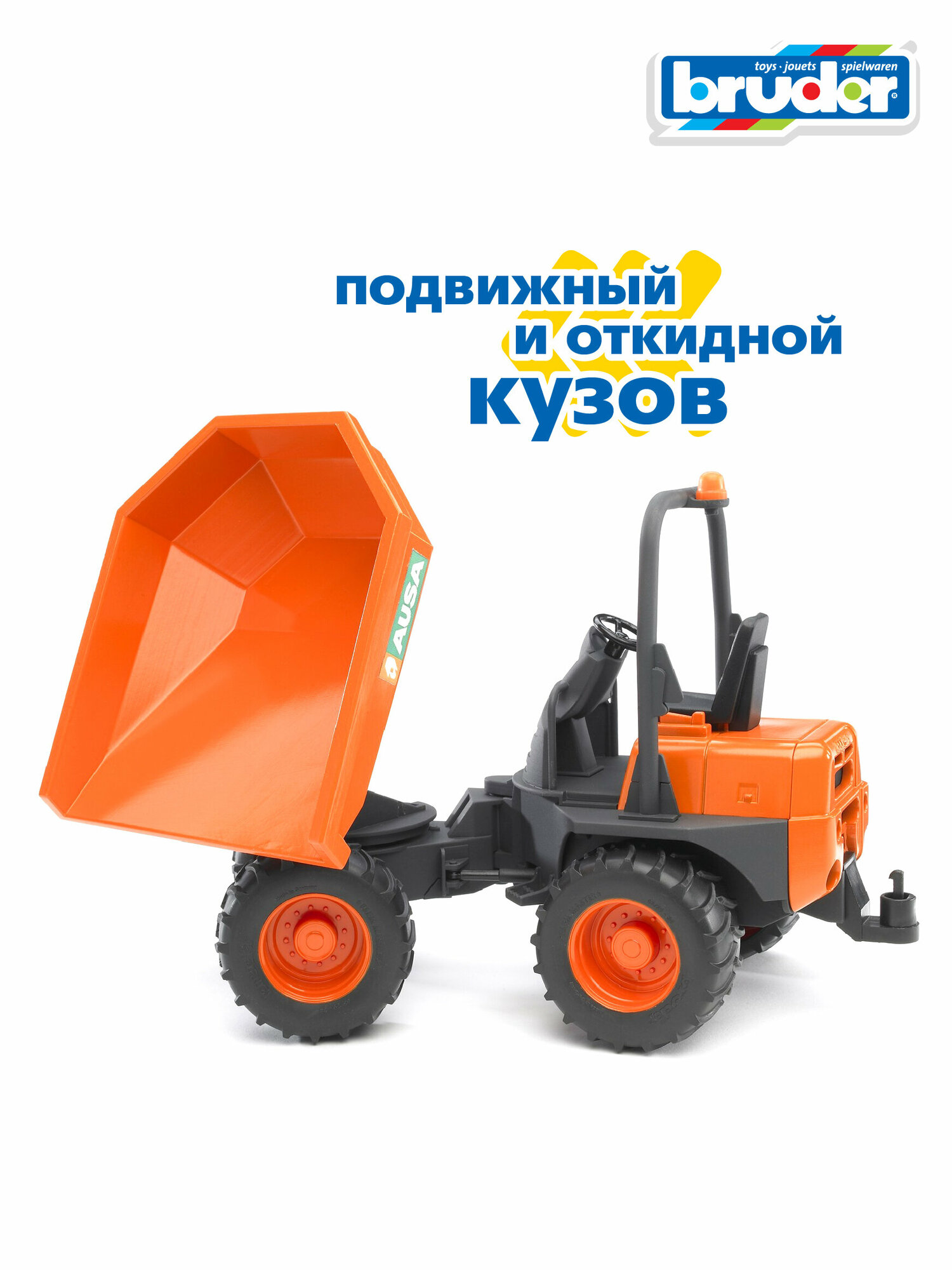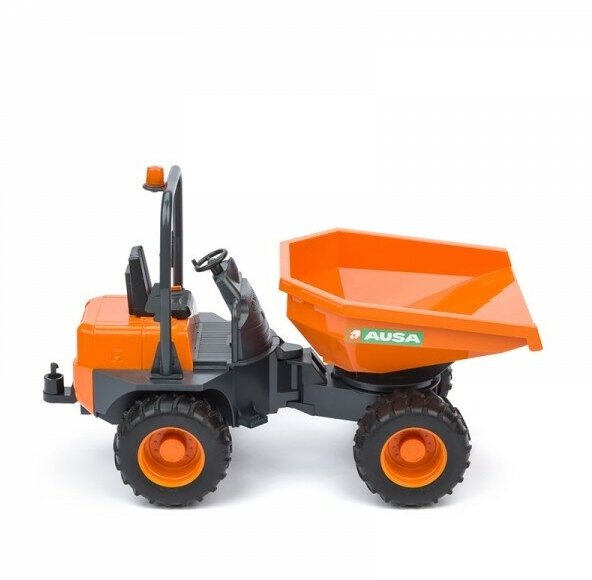 Игрушка BRUDER AUSA – масштабная модель легкого самосвала, использующегося для перевозки сыпучих материалов на небольших стройплощадках. Она снабжена откидным кузовом, шарнирной рамой и сидением с местом для фигурки водителя. В ней предусмотрена сцепная муфта для буксировки других транспортных средств. Мягкие колеса машинки легко очищаются от грязи и не оставляют следов на чувствительных напольных покрытиях. Высокий уровень детализации делает игрушку подходящей для коллекционирования.