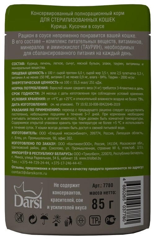 Корм для кошек Дарси для стерилизованных кошек курица - консервированный полнорационный корм для взрослых кошек. Формула с учётом профилактики развития ожирения и мочекаменной болезни. Дополнительный источник влаги, профилактика образования уралитов.