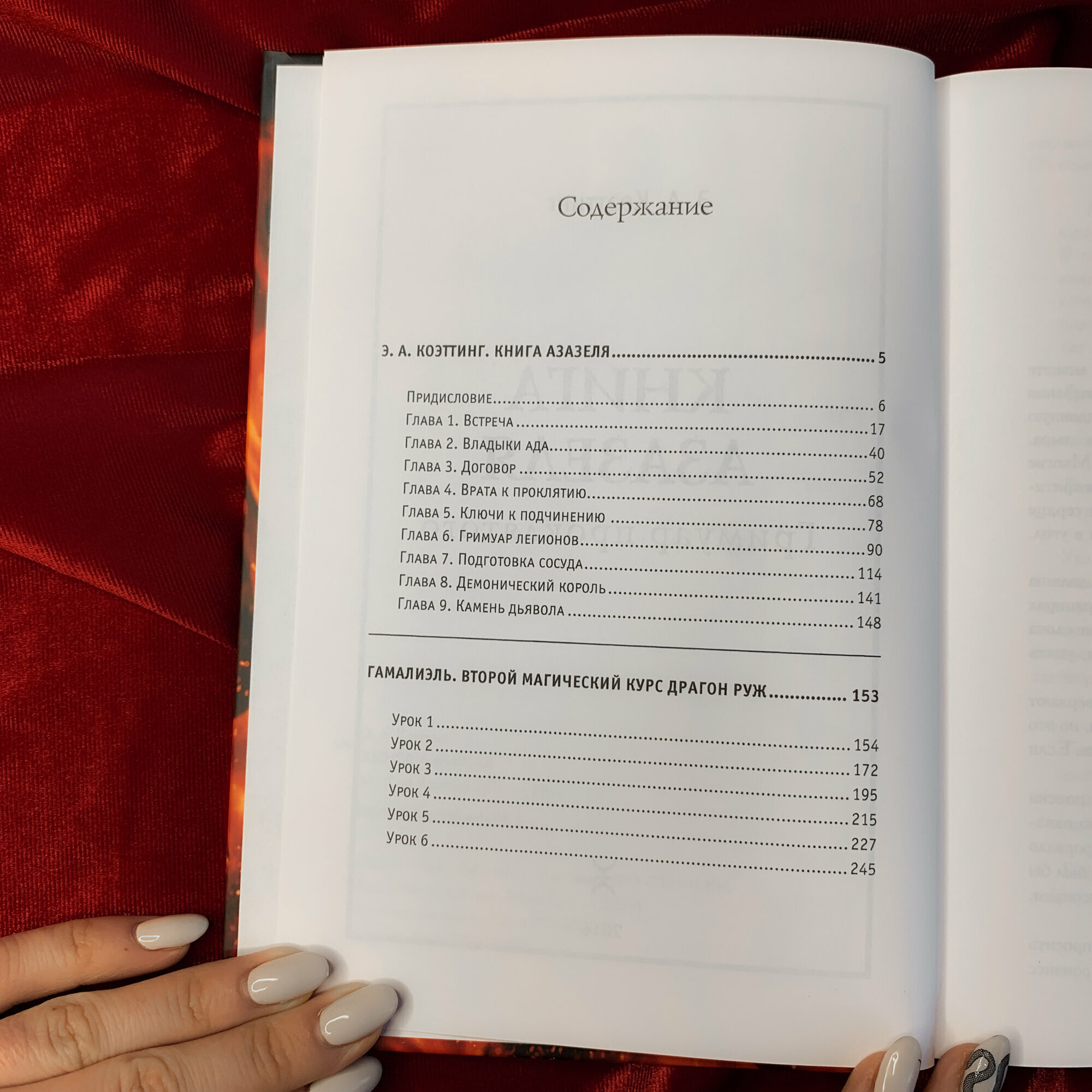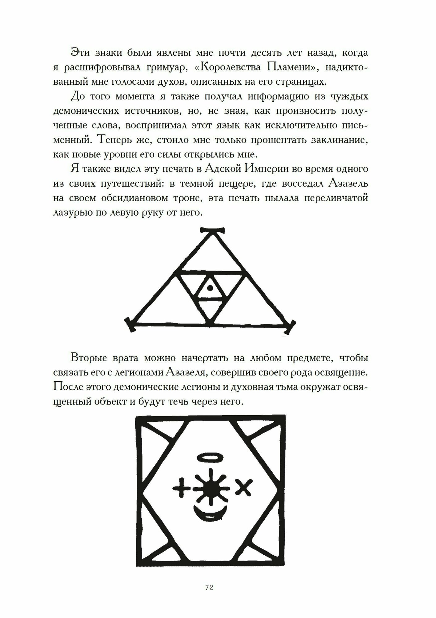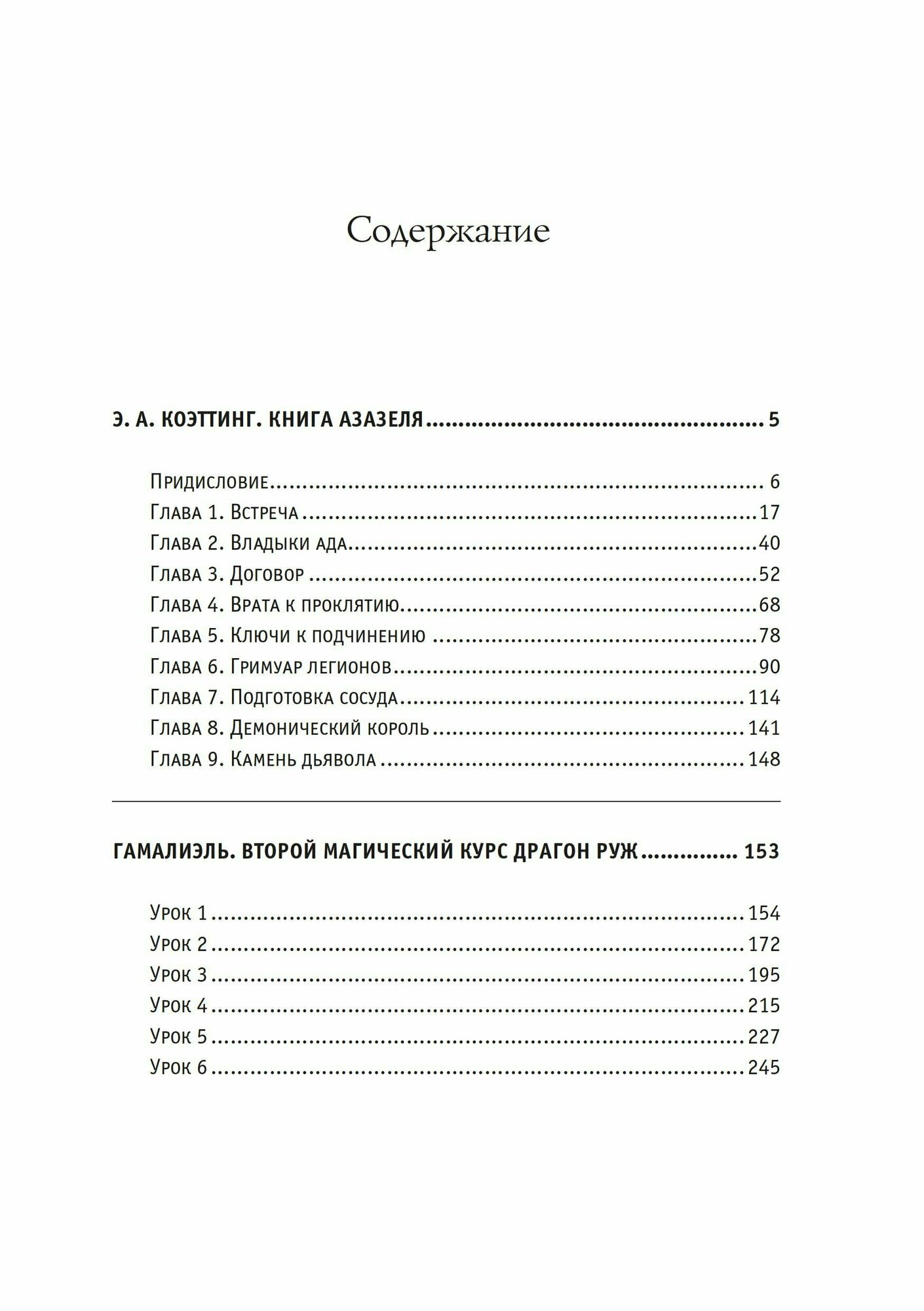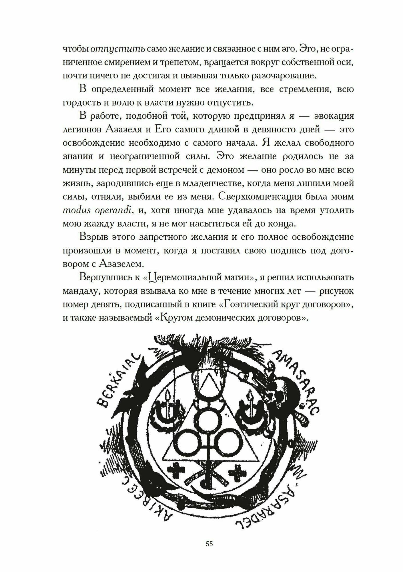 Это уже вторая книга Коэттинга, изданная на русском языке и содержащая последовательно раскрываемую технологию и личный опыт взаимодействия с избранной темной сущностью, или с темной сущностью, самой избравшей мага, в данном случае с Азазелем. Ядро книги составляет Гримуар легионов, с описанием иерархии тонкоматериальных существ, возглавляемых Азазелем. Как отмечал переводчик другой изданной у нас книги Коэттинга, представленные сигилы дают ощутимые практические результаты, хотя они появляются впервые в этой книге. Также следует отметить, что во второй части книги представлен второй, продвинутый магический курс ордена Дракон Руж, авторства Гамалиэль.