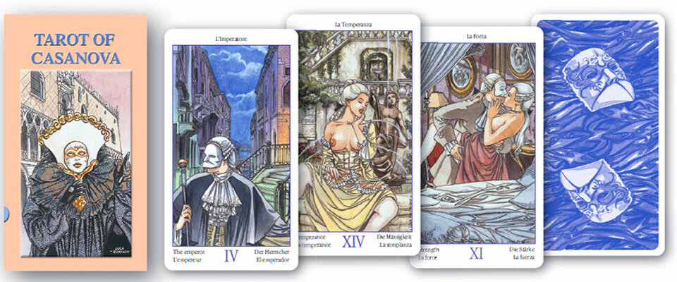 Колода выпущена издательством Lo Scarabeo в 2000 году. Авторы колоды Mario Pignatiello и Luca Raimondo. Эротические Таро Казановы, основанно на событиях жизни Казановы и жизни в Венеции. Изображения содержат изрядное количество наготы. Для лучшего понимания колоды лучше почитать мемуары Казановы. На мой взгляд колода, лучше, чем так любимая всеми Манара. В ней нет перегибов и пошлости, а значения и символы более понятны и прозрачны. Все очень выдержано в стиле, хотя, конечно, это эротика. НО не порнография! Жизнь в этой колоде внимательно изучена через чувственную призму, но не про высокую любовь, а про любовь как бизнес, такой очень мужской подход.