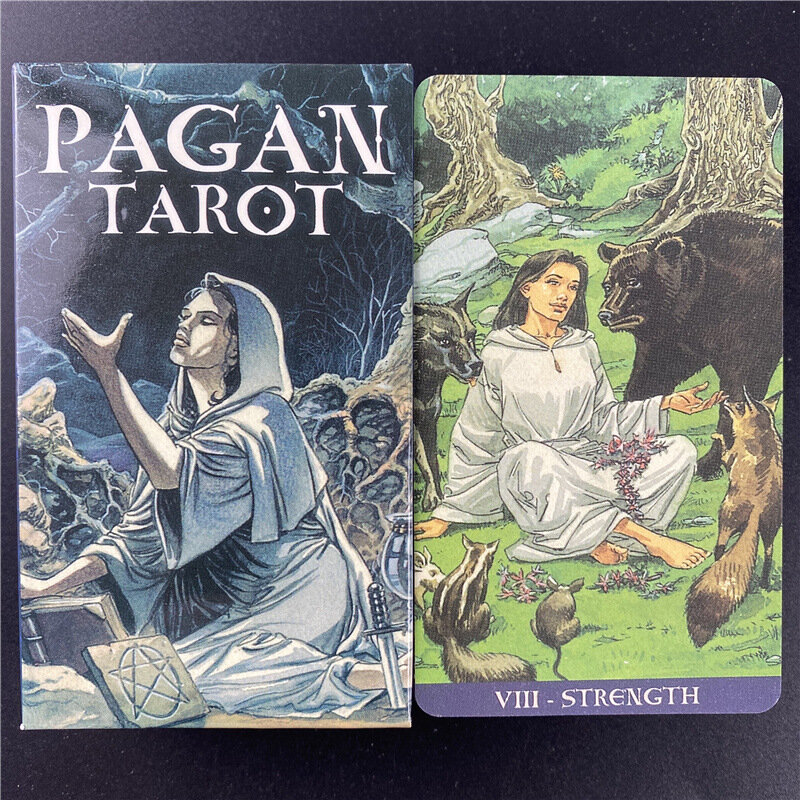 Языческое Таро одна из моих любимых рабочих колод. Имеет довольно современные сюжеты из жизни виккантской ведьмы наших дней. Она водит машину, ходит по магазинам, ищет работу и многое другое... в общем делает все то, что и остальные современные люди. В связи с этим, колода довольна понятна в интерпретации и отлично подходит для повседневных бытовых вопросов, а также для вопросов работы и финансов. Для некоторых карт подойдут классические толкования, однако прорисовка некоторых арканов отличается от привычной и имеет отличные от классических значения. Некоторые затруднения вызывают придворные карты в этой колоде. Они здесь представлены в виде Элементалей, Новичков, Посвященных и Старейших. Элементалии отображают чистую энергию каждой из четырех стихий. Остальные придворные карты это люди разного возраста и разной степени посвящения. При этом на Кубках и Пентаклях изображены женщины, а на Мечах и Жезлах мужчины. Издательство с 2014 года заменило авторские названия карт - Элементаль, Новичок, Инициируемый, Старший, на классические значения - Паж, Рыцарь, Королева, Король зачем... непонятно. Младшие арканы пронумерованы от 1 до 14. По ощущениям колода очень приятная, выполнена в зеленовато-коричневых тонах, мягкая, женственная, спокойная, гармоничная.
