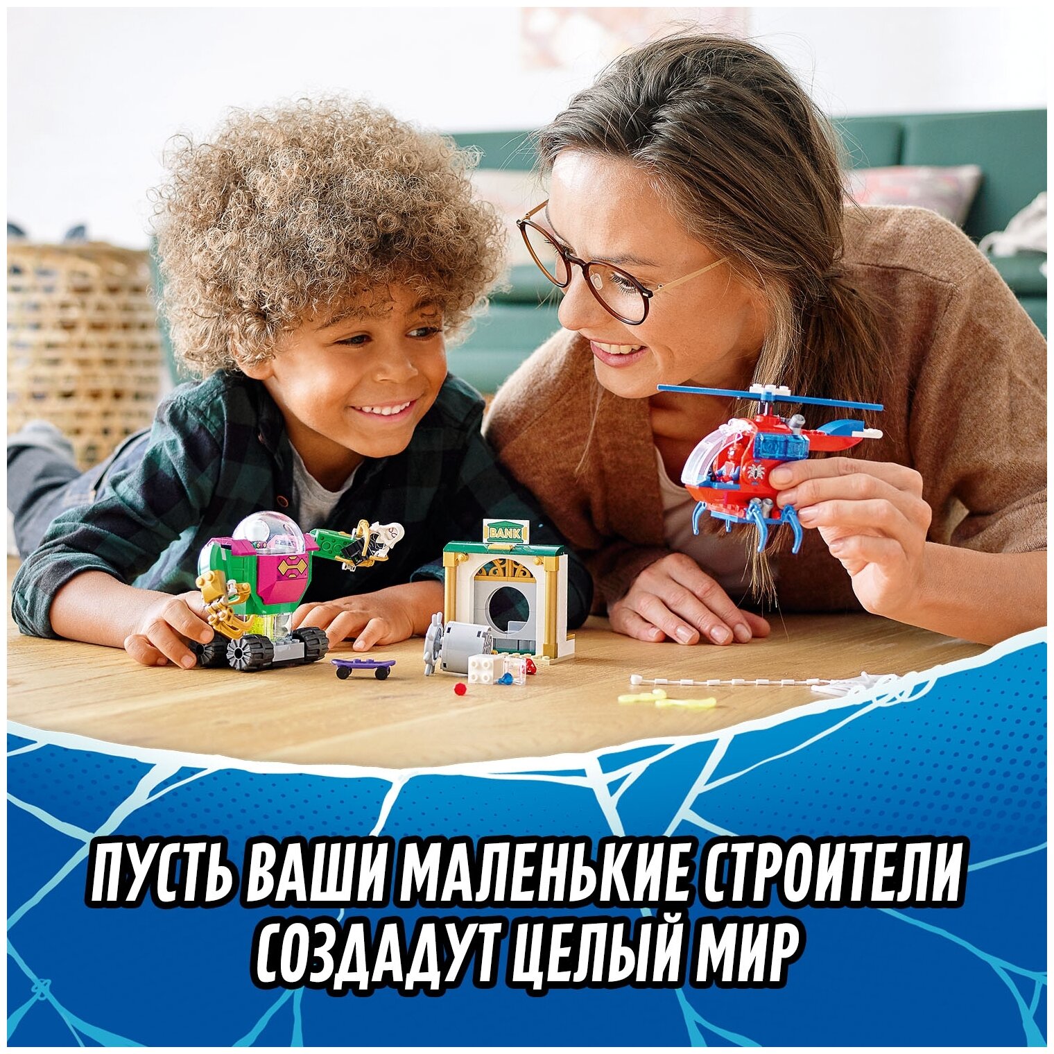 - В этот полный приключений набор входят минифигурки Человека-паука, Паука-призрака, а также минифигурка Мистерио, впервые выпущенная в январе 2020 года. Он также включает в себя вертолёт Человека-паука, робота Мистерио и здание банка, одна из стен которого «разрушается», открывая доступ к хранилищу!