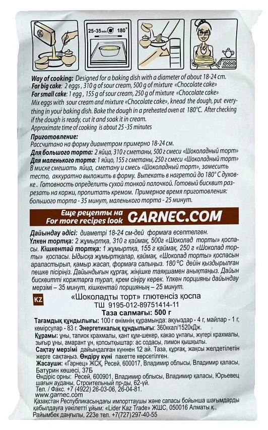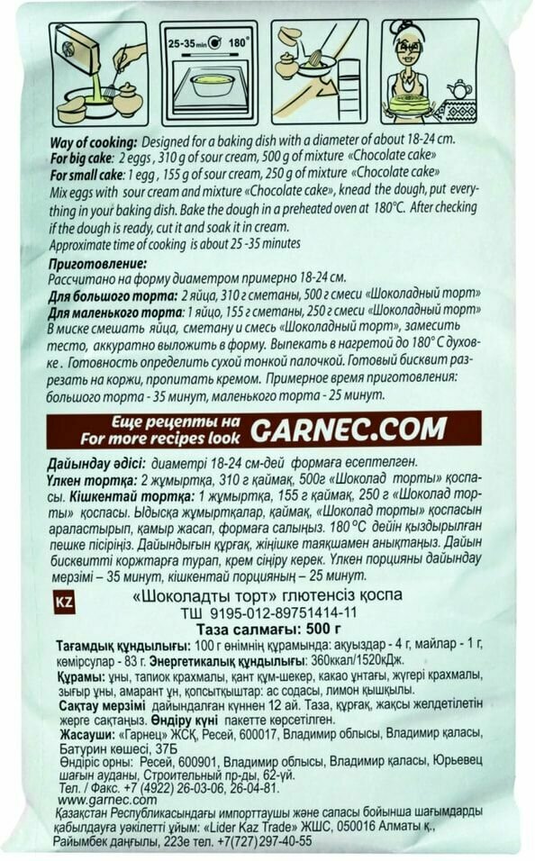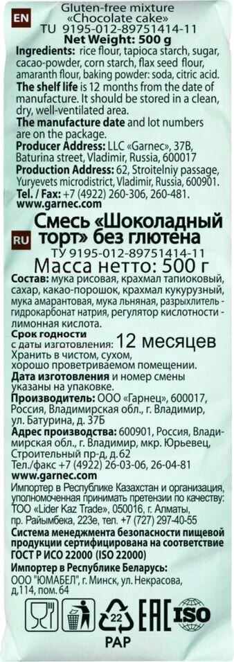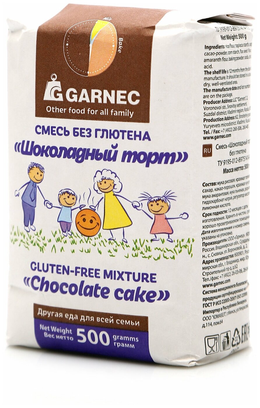 Смесь для выпечки Garnec Шоколадный торт без глютена 500г поможет вам приготовить вкуснейшее лакомство для всей семьи. Это натуральная смесь, в состав которой входит рисовая, амарантовая и льняная мука, кукурузный и тапиоковый крахмал, сахар, какао-порошок и разрыхлитель. Важная особенность всех компонентов – отсутствие глютена, способного вызывать аллергические реакции и нарушать пищеварение. Безглютеновая продукция торговой марки «Гарнец» производится из высококачественного сырья в отдельном помещении на специальном оборудовании. Она не содержит ГМО, красителей, консервантов, ароматизаторов, усилителей вкуса и прочих искусственных добавок, поэтому идеально подходит для людей, придерживающихся здорового питания. Качество продукта соответствует стандарту Ассоциации европейских обществ целиакии. Продукт предназначен для всей семьи. Все компоненты и готовая продукция проходят контроль на содержание глютена. Отсутствуют ароматизаторы усилители вкуса и другие химические добавки.