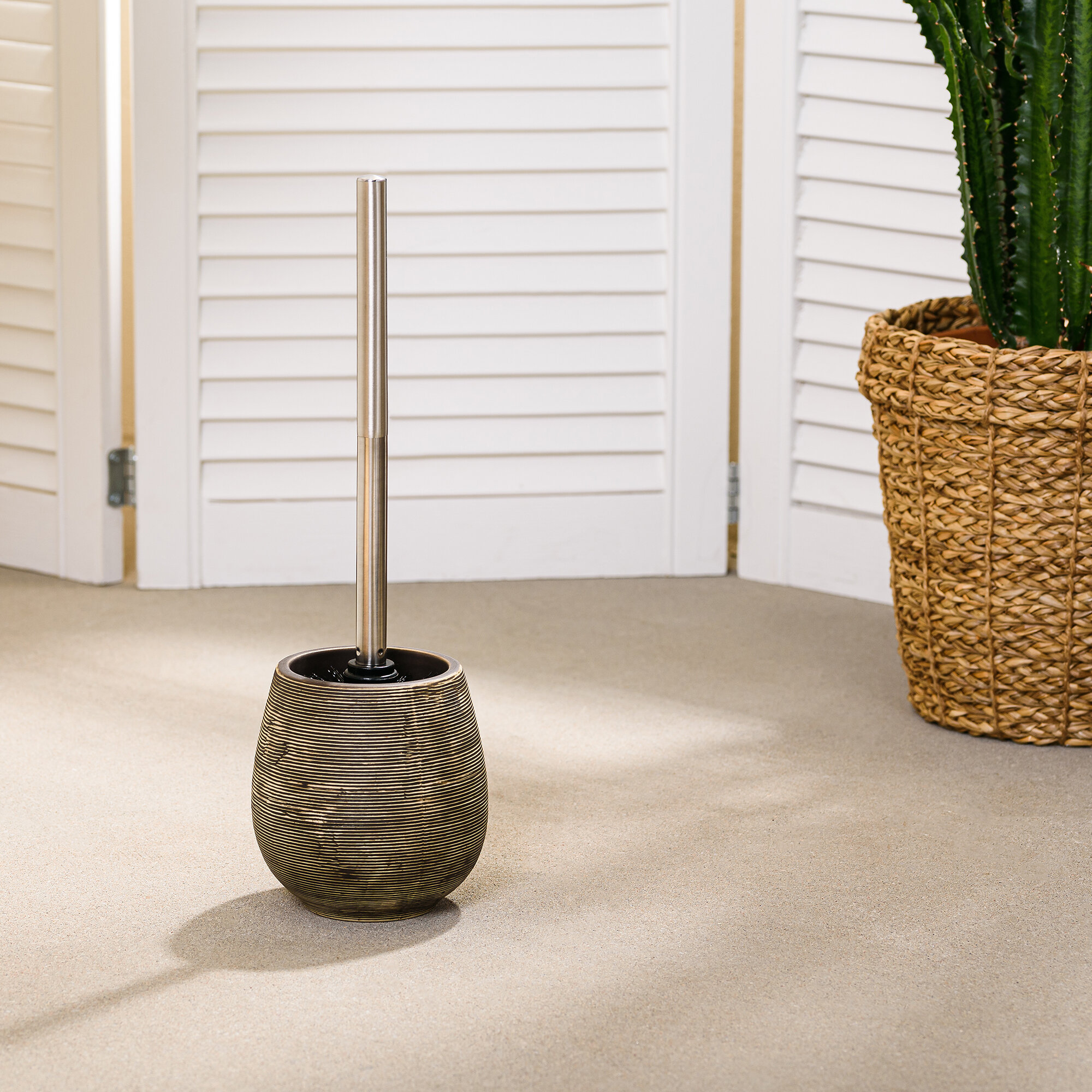 Дополнить интерьер в стиле минимализм поможет оригинальный ершик для туалета, выполненный в коричневых тонах. Изделие, изготовлено из керамики, которая требует бережного ухода с применением щадящих моющих средств.