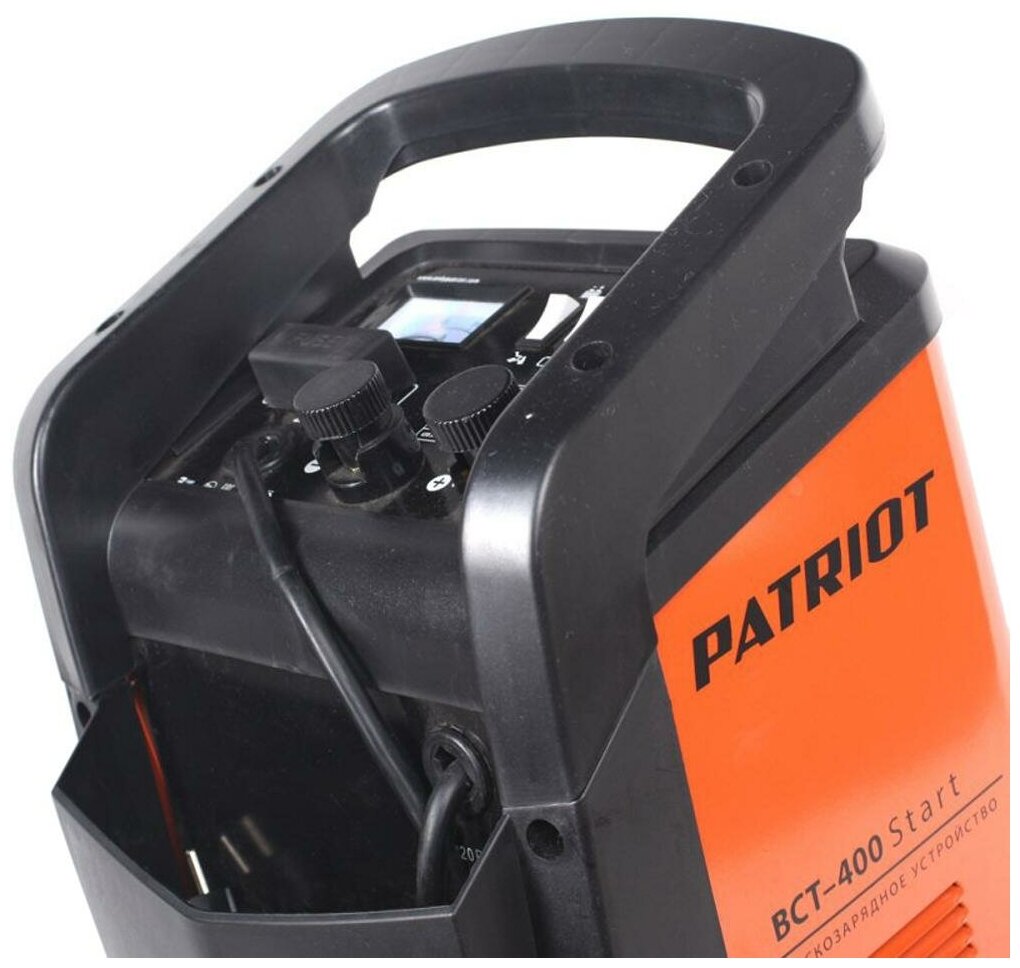 | Прочие особенности и свойства | Пускозарядное устройство PATRIOT BCT-400 Start 650301543 используется для зарядки и легкого запуска в холодное время года различных типов свинцово-кислотных аккумуляторных батарей максимальной емкостью до 700 Ач. Спереди на корпусе имеется карман для удобного хранения всех проводов. Два больших колеса по бокам гарантируют легкое перемещение по рабочей площадке. |