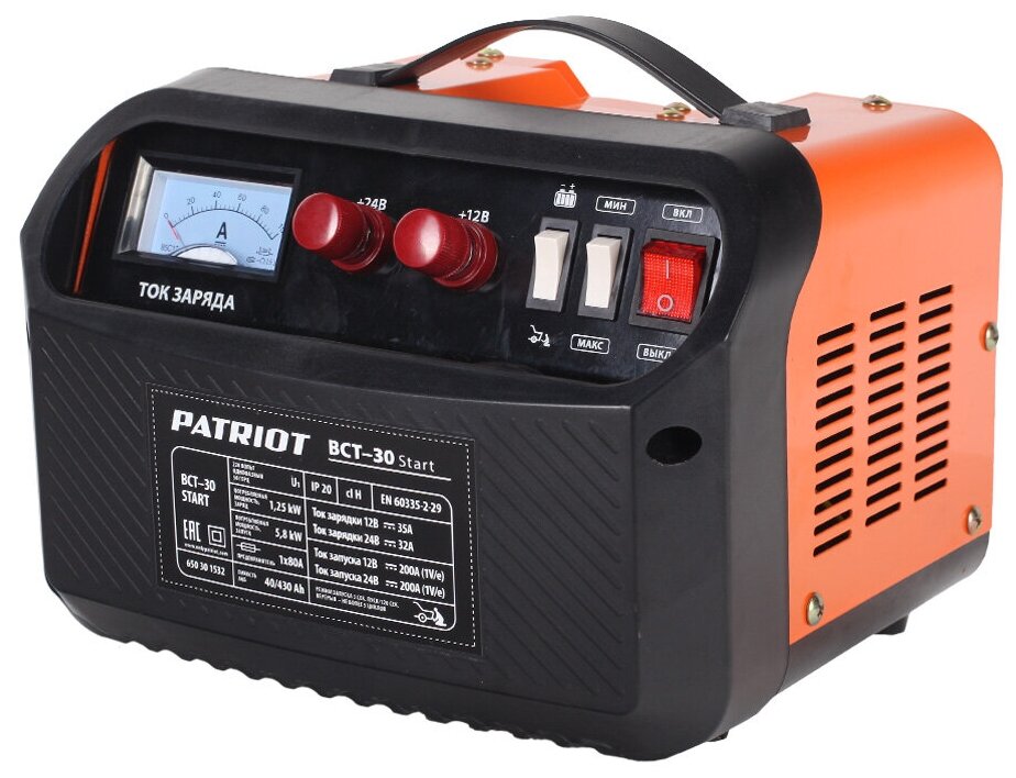| Прочие особенности и свойства | Пускозарядное устройство PATRIOT BCT- 30 Start 650301532 используется как автолюбителями, так и профессиональными автомеханиками для быстрой и качественной зарядки различных типов свинцово-кислотных аккумуляторов, рассчитанных на напряжение 12 и 24 В. Также модель может применяться для запуска двигателя автомобиля в холодную погоду. Простой лаконичный дизайн и компактный корпус делают устройство удобным и простым в эксплуатации. |
