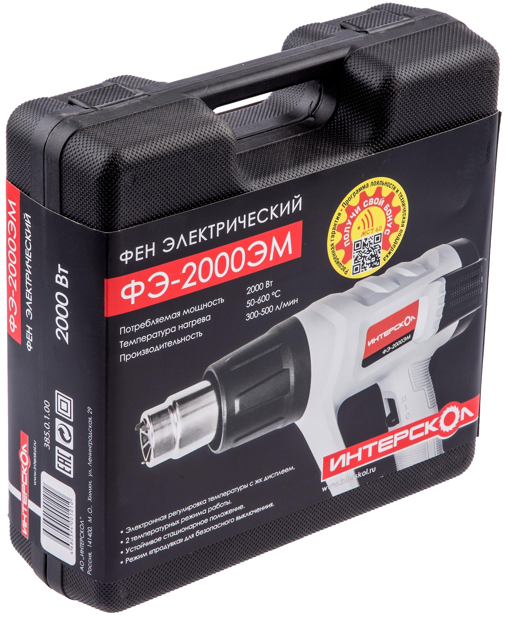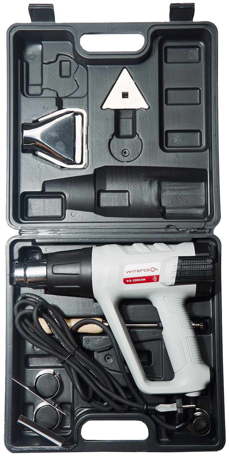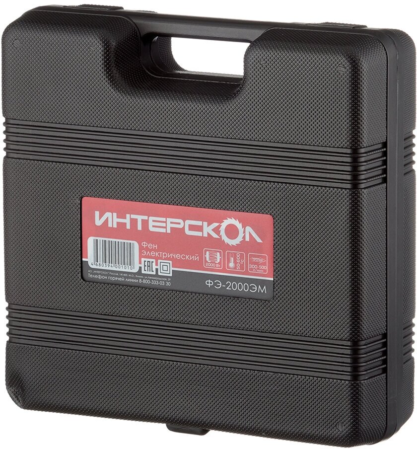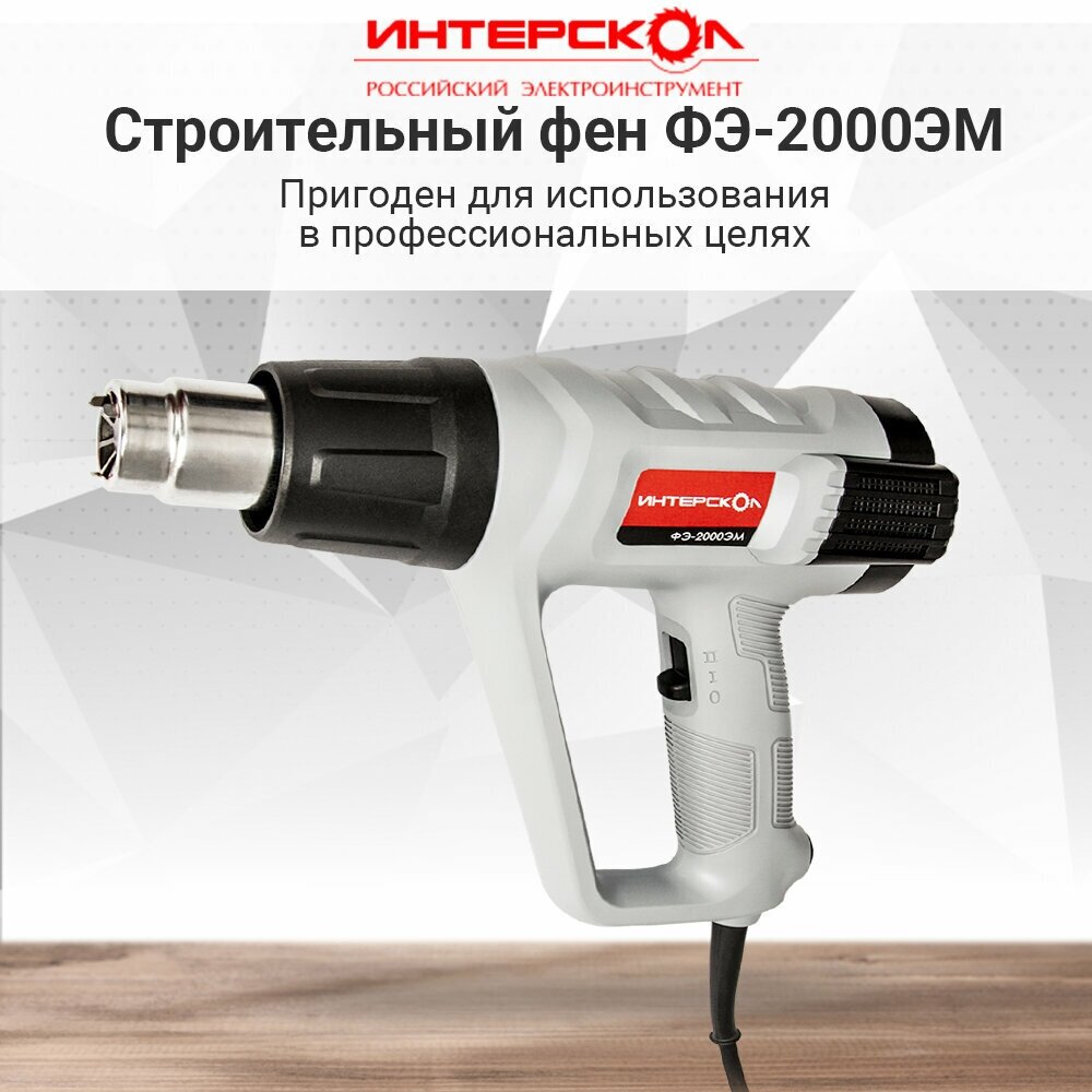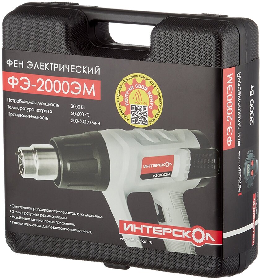 | Прочие особенности и свойства | Заданный уровень нагрева отображается на цифровом ЖК-дисплее на тыльной части устройства, здесь же находятся кнопки, при помощи которых задается необходимая температура. Предусмотрен также режим продувки: при выключении фена вентилятор продолжает вращаться в течение 20 секунд, охлаждая нагревательный элемент во избежание перегрева и выхода из строя электронной схемы. Кроме того, конструкция позволяет установить ее вертикально соплом вверх на стол, что очень удобно в тех случаях, когда обрабатываемую деталь приходится держать двумя руками., , Комплектация, Фен электрический ФЭ-2000ЭМ 1 шт., Руководство по эксплуатации и Инструкция по безопасности 1 шт., Цикля (скребок) 1 шт., Рукоятка 1 шт., Насадка редукционная 1 шт., Насадка плоская 1 шт., Насадка «паяльное зеркало» 1 шт., Насадка направляющая 1 шт., Кейс пластиковый 1 шт. |