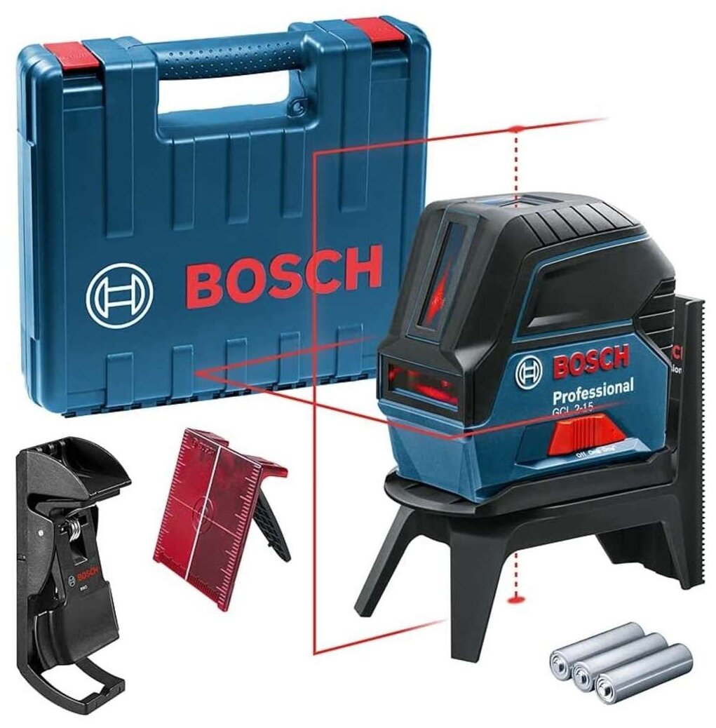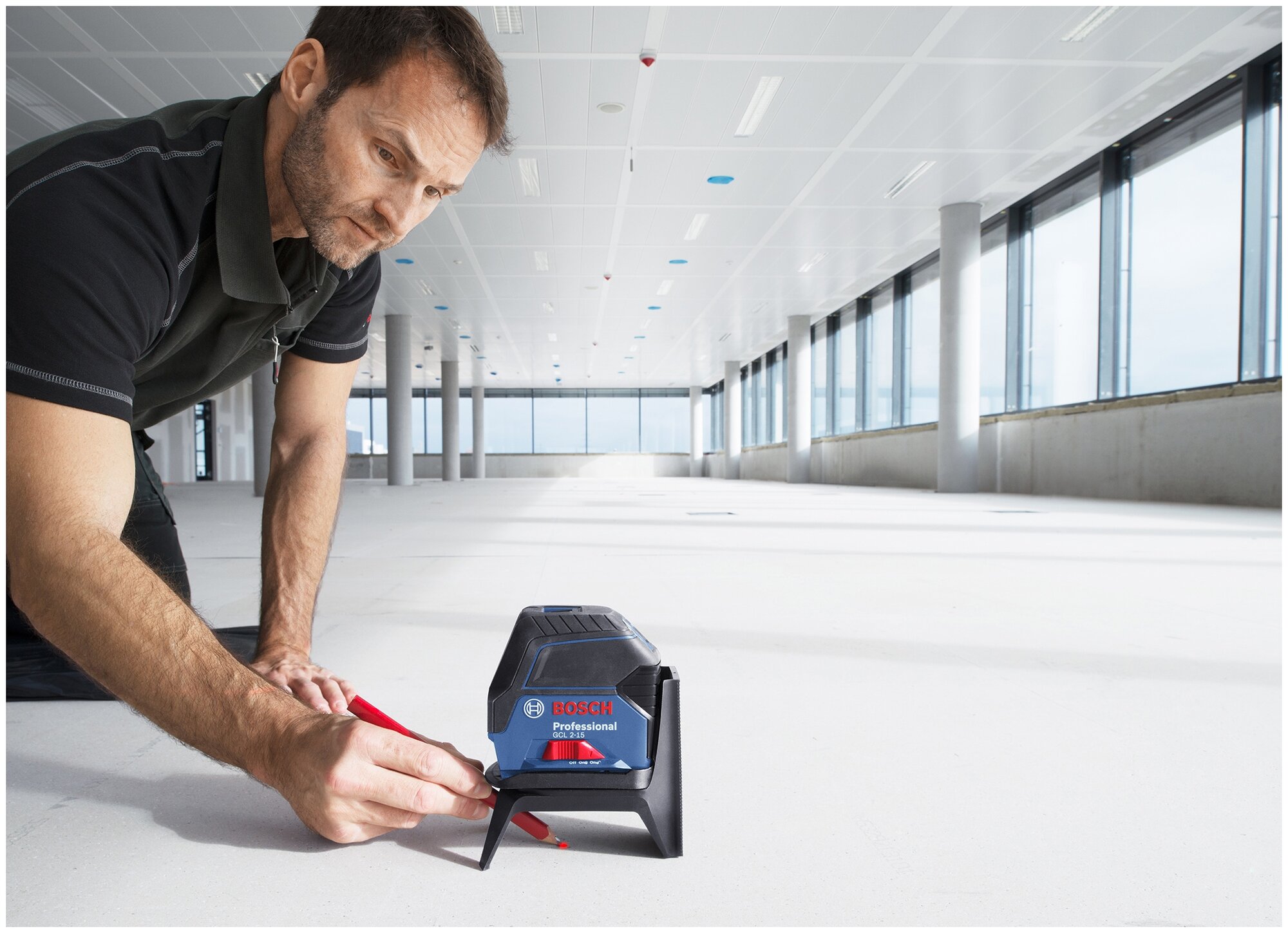 BOSCH GCL 2-15 – профессиональный линейный нивелир с высокой точностью измерений. Погрешности ±0,3 мм/м. Оснащён системой автоматического выравнивания в пределах ±4°. Маятниковый компенсатор оборудован фиксатором для безопасной транспортировки. Дальность проецирования до 15 м. Формирует горизонтальные и вертикальные линии, в том числе перекрёстные.