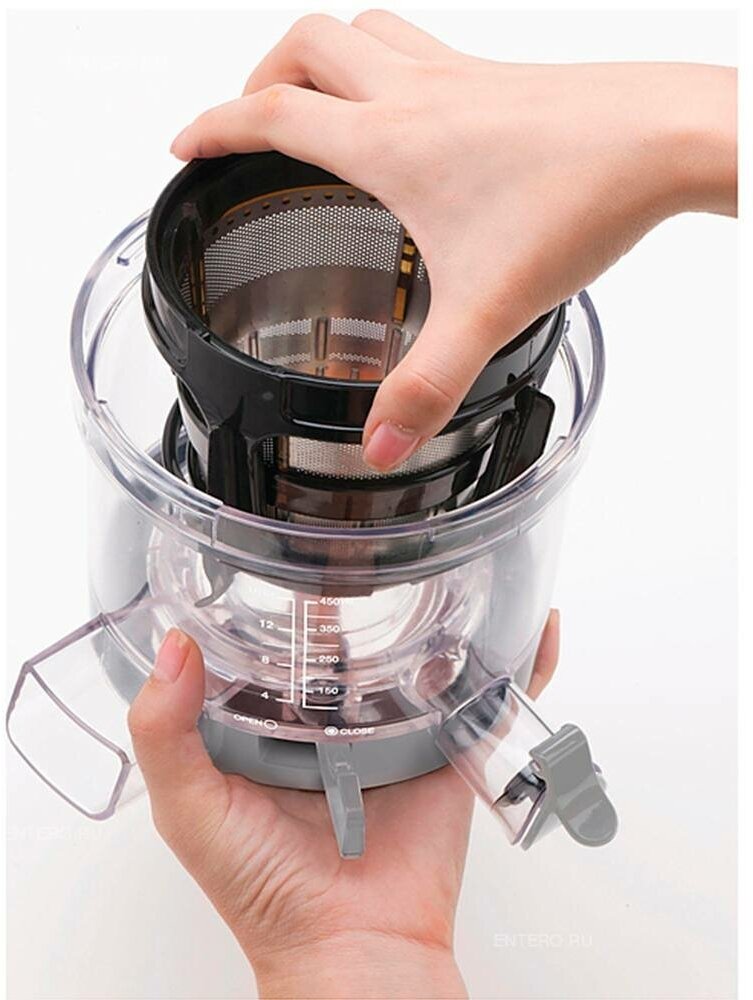 Чаша для сбора сока (емкостью 1,6 л) изготовлена из уникального материала Tritan. Он экологичный, не сохраняет запахи продуктов, ударопрочный, стойкий к образованию пятен и признанный лучшим для использования в медицинской промышленности, что говорит о его полной безопасности. Шнек и чаша для отжима сделаны из новейшего материала Ultem: это биологически безопасный, сертифицированный по ISO пластик, используемый в аэрокосмической области. Корпус соковыжималки выполнен из пластика, и оснащен прорезиненными ножками, которые обеспечат безопасное использование прибора даже на скользкой поверхности. Прибор оснащен удобным рычагом регулировки концентрации сока, чтобы приготовить нужный вам напиток. Технология медленного отжима позволяет получить максимальный выход продуктов для сока. В комплекте с соковыжималкой есть две щеточки для чистки для удобства ухода, и книга с рецептами, которая поможет разнообразить ваше меню.