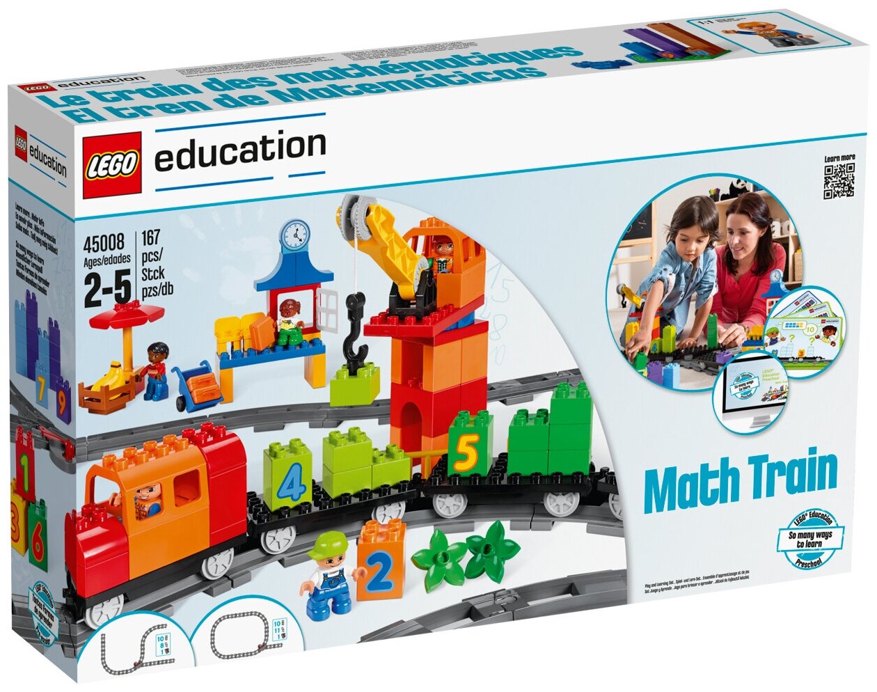 Lego Education (45008) — это классический конструктор, представляющий собой учебно-методический комплекс из 167 деталей. Загружаем вагончики-цифры кубиками и поехали! Игра поможет ребятам правильно считать по порядку, сравнивать количество кубиков. Набор научит: быстрому счёту; словам-числительным; порядку в цифрах; быть внимательным и быстрым; аккуратности и точности движений.
