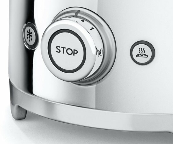 Яркий тостер на два ломтика Smeg TSF01SSEU из коллекции «стиль 50-х годов» дополнит интерьер кухни. Функция «багель» подрумянивает одну сторону булочки, а функция «размораживание» предназначена для поджаривания замороженного хлеба. С помощью круглой ручки можно выбрать один из 6 уровней мощности. Во время активации функций подсвечиваются соответствующие кнопки. При необходимости можно уложить провод под основанием тостера.